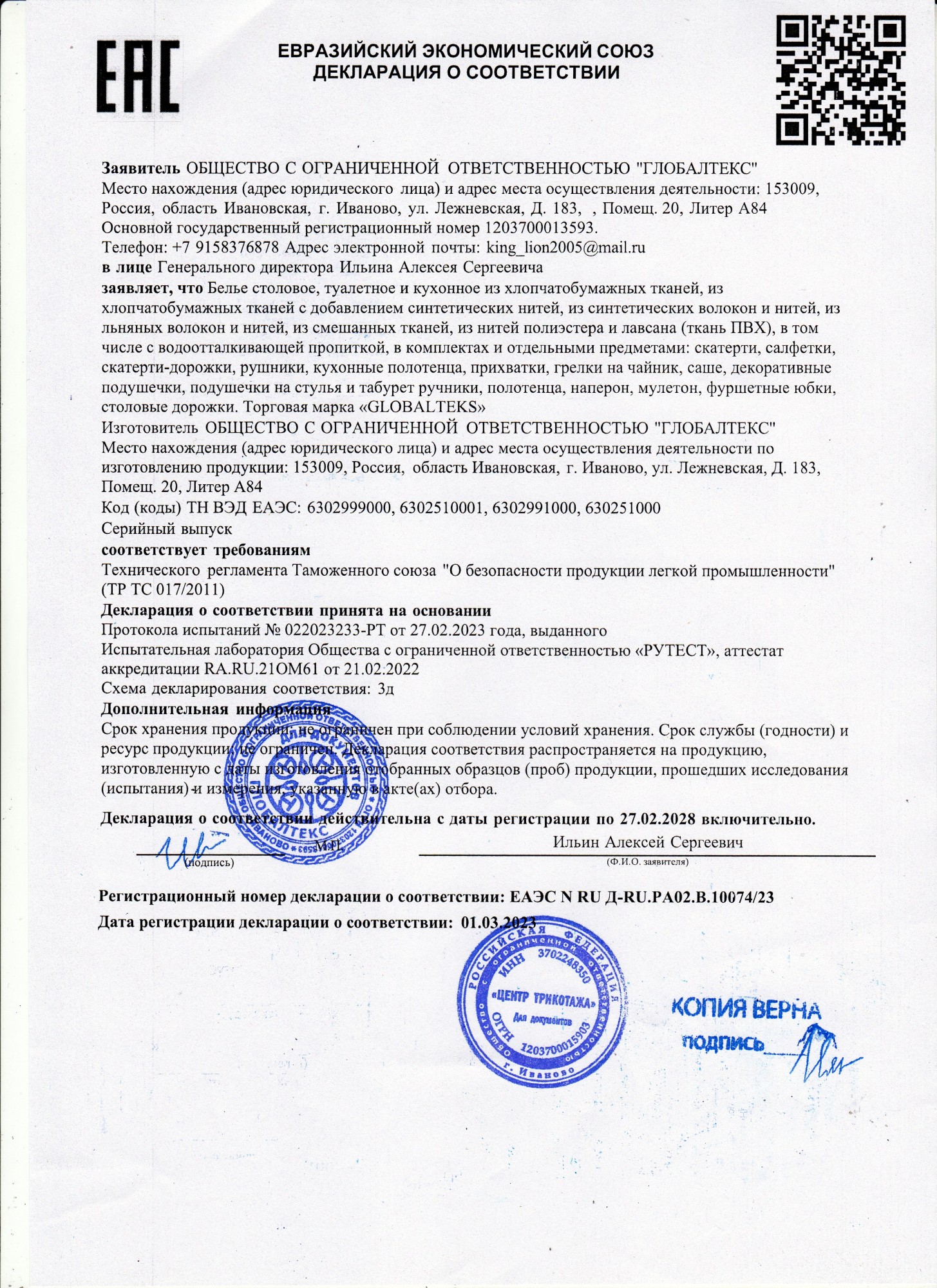 Документы производителя Бельё столовое