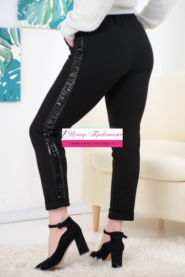 Классические женские брючки из плотного трикотажа с пайеточными лампасами. Прекрасная посадка, длина 7/8. Немного зауженные, низ отделан манжетой.
