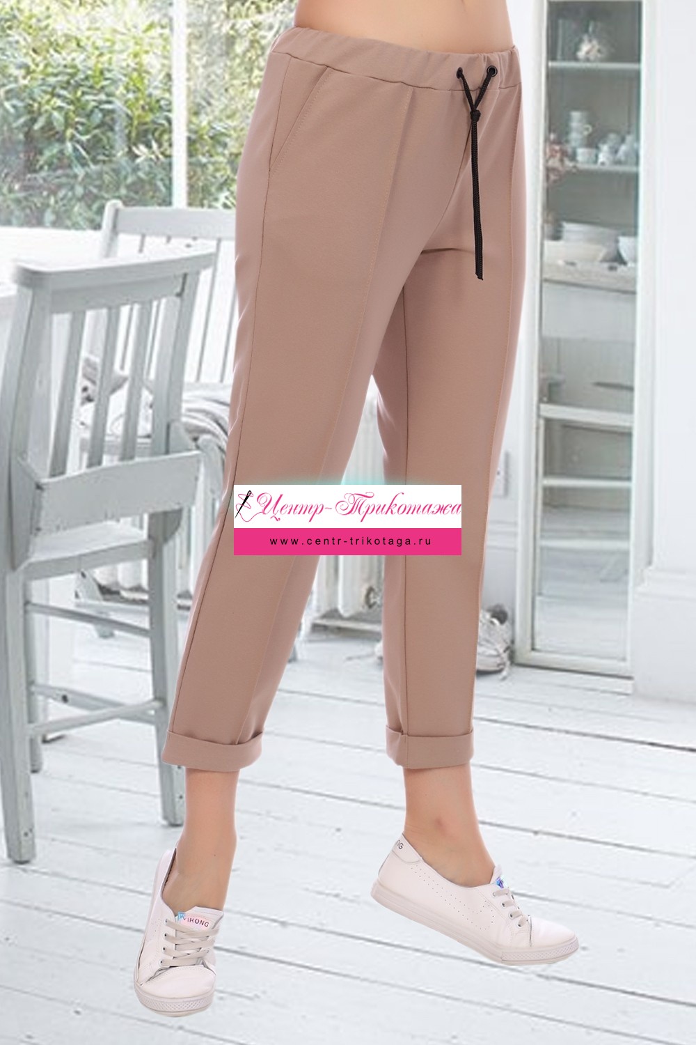 Брюки женские классического силуэта, прямые, с отворотом по низу. Декоративная отстрочка по центру в виде стрелки придает брюкам элегантность. Внутренние карманы, пояс на резинке. Внутрь пояса вставлен шнур для более точной регулировки.