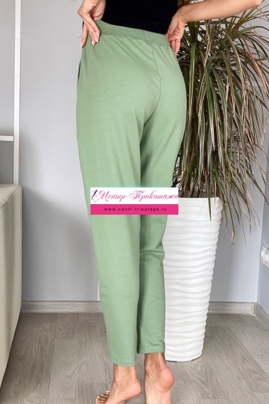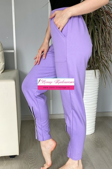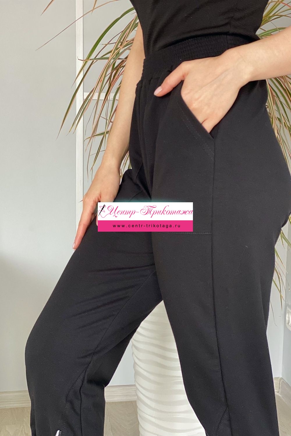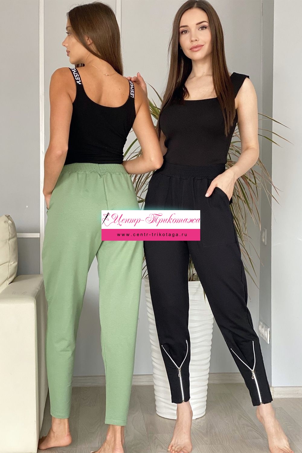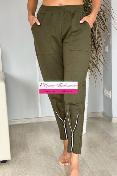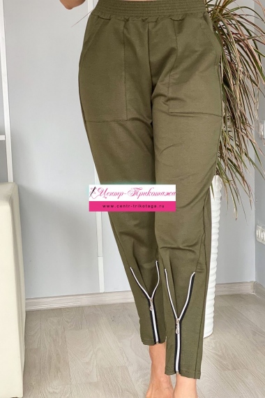 Брюки свободные, с боковыми накладными карманами, на эластичном поясе. В нижней части передних половинок обработаны декоративные элементы с молниями.