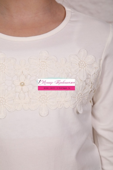 Блузка для девочек дошкольного, младшего и старшего школьного возраста, из однотонного трикотажного полотна кулирка с лайкрой. Блузка прямого силуэта, с втачным рукавом, без застежки. Спереди и на спинке отсутствуют линии членения. На передней части джемпера настрочено кружево по линии груди. Срез горловины обработан узкой окантовочной лентой из того же полотна в 4 сложения. Рукав одношовный, длинный. Низ рукава без манжеты, подогнут. На кружево приклеены 3 полубусины.