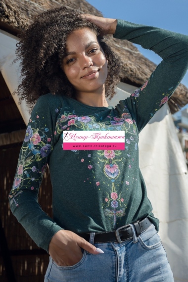 Универсальная модель из очень мягкой, комфортной к телу ткани. Прекрасно комбинируется с лосинами, джинсами, юбками, брюками. Полочка и рукава оформлены красивым цветочным принтом со стрекозами с добавлением золотого глиттера. Ткань очень хорошо тянется.