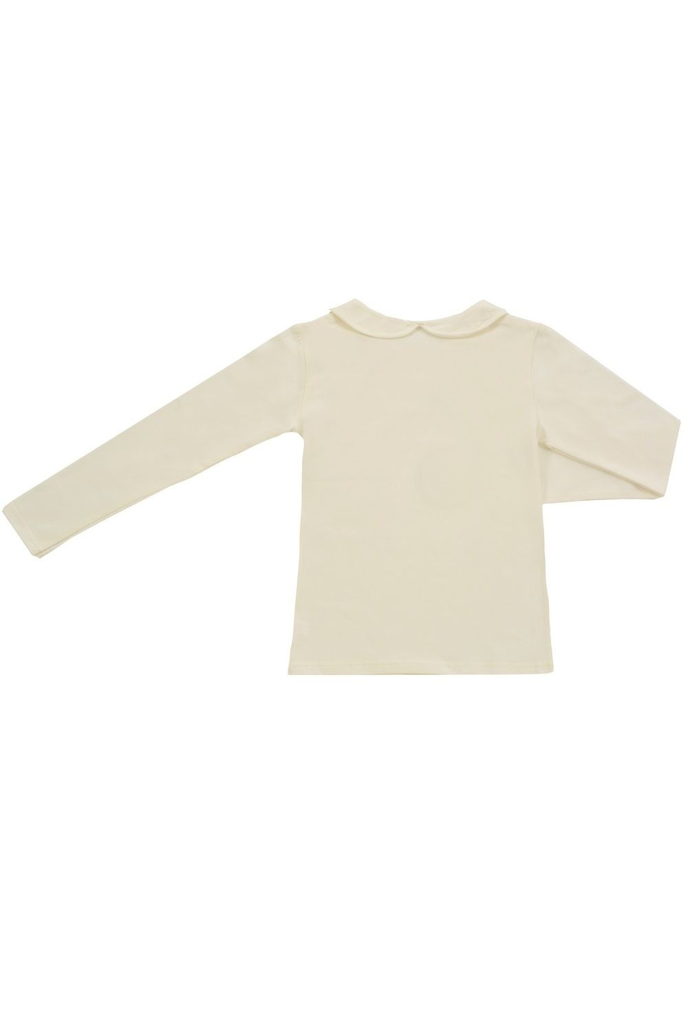 Блузка для девочек младшего и старшего школьного возраста, из трикотажного однотонного полотна – кулирка с лайкрой. Блузка полуприлегающего силуэта, с втачным длинным рукавом, без застежки, с воротником на базе плосколежащего с концами округлой формы. Спереди и на спинке отсутствуют линии членения. Круглые концы воротника обработаны узкой окантовочной лентой из того же полотна в 4 сложения. Рукав одношовный. Низа рукава и изделия подогнуты. Спереди по центру горловины прикреплена брошь.