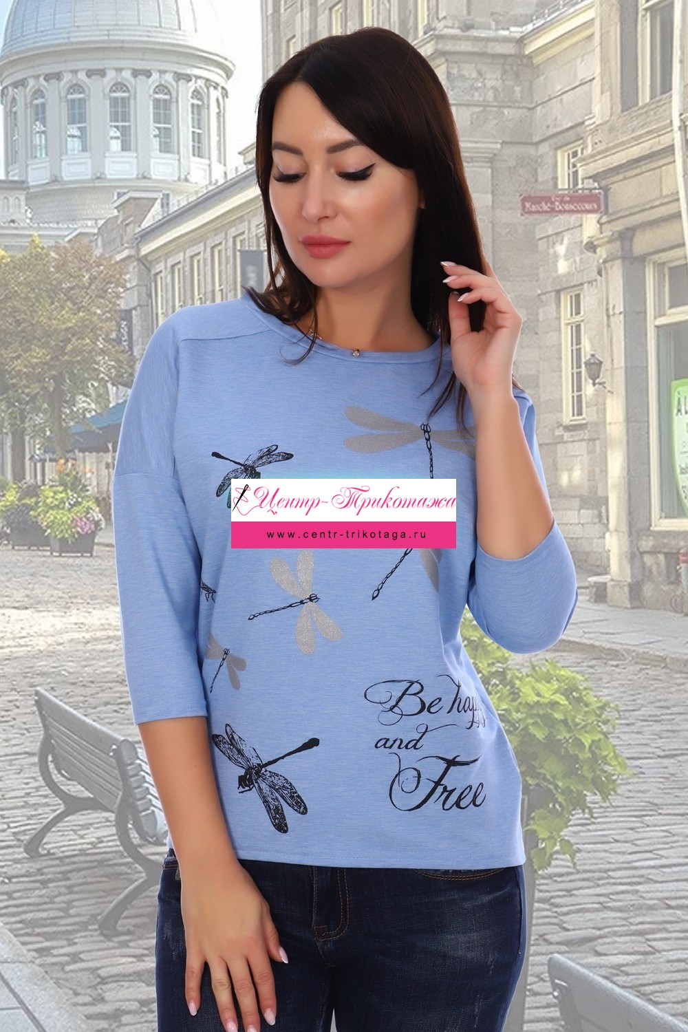 Джемпер с принтом, круглая горловина обработана обтачкой, спущенная пройма, рукав 3/4. На спинке кокетка, низ спинки слегка удлинён.