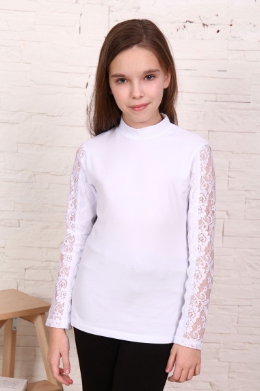 Блузка для девочек младшего и старшего школьного возраста, из однотонного трикотажного полотна кулирка с лайкрой. Блузка полуприлегающего силуэта, с втачным рукавом, без застежки, с воротником - стойкой. Спереди и на спинке отсутствуют линии членения. Рукав одношовный с кружевной вставкой, длинный. Низ рукава без манжеты, подогнут.