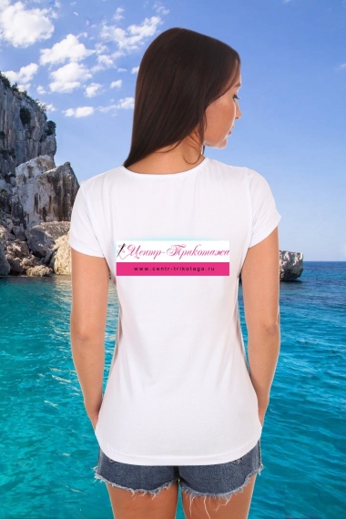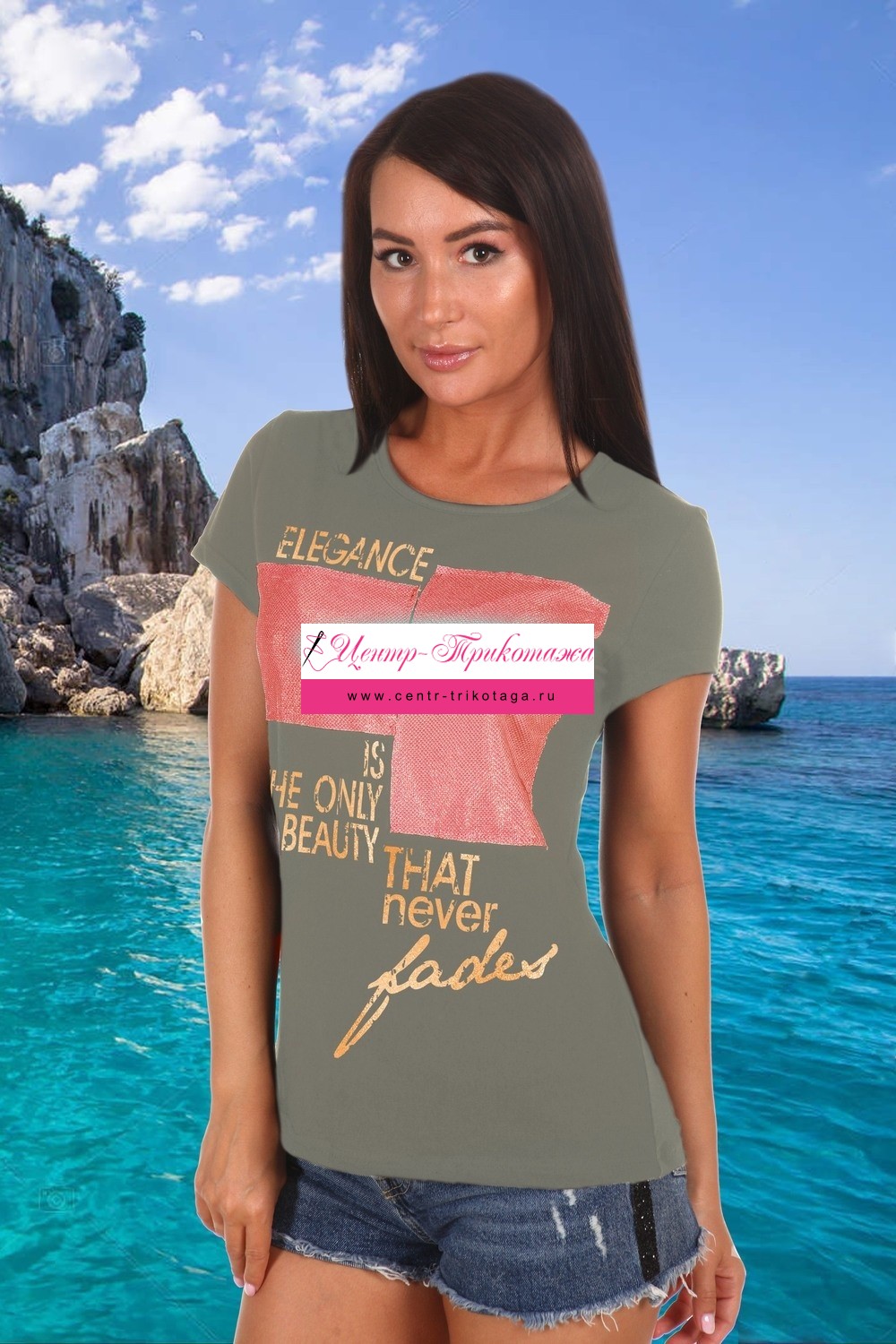 Футболка полуприлегающего силуэта, с округлой горловиной, длиной до середины бедра. Рукав втачной короткий. На полочке расположены декоративные элементы из отделочного полотна. Горловина обработана бейкой