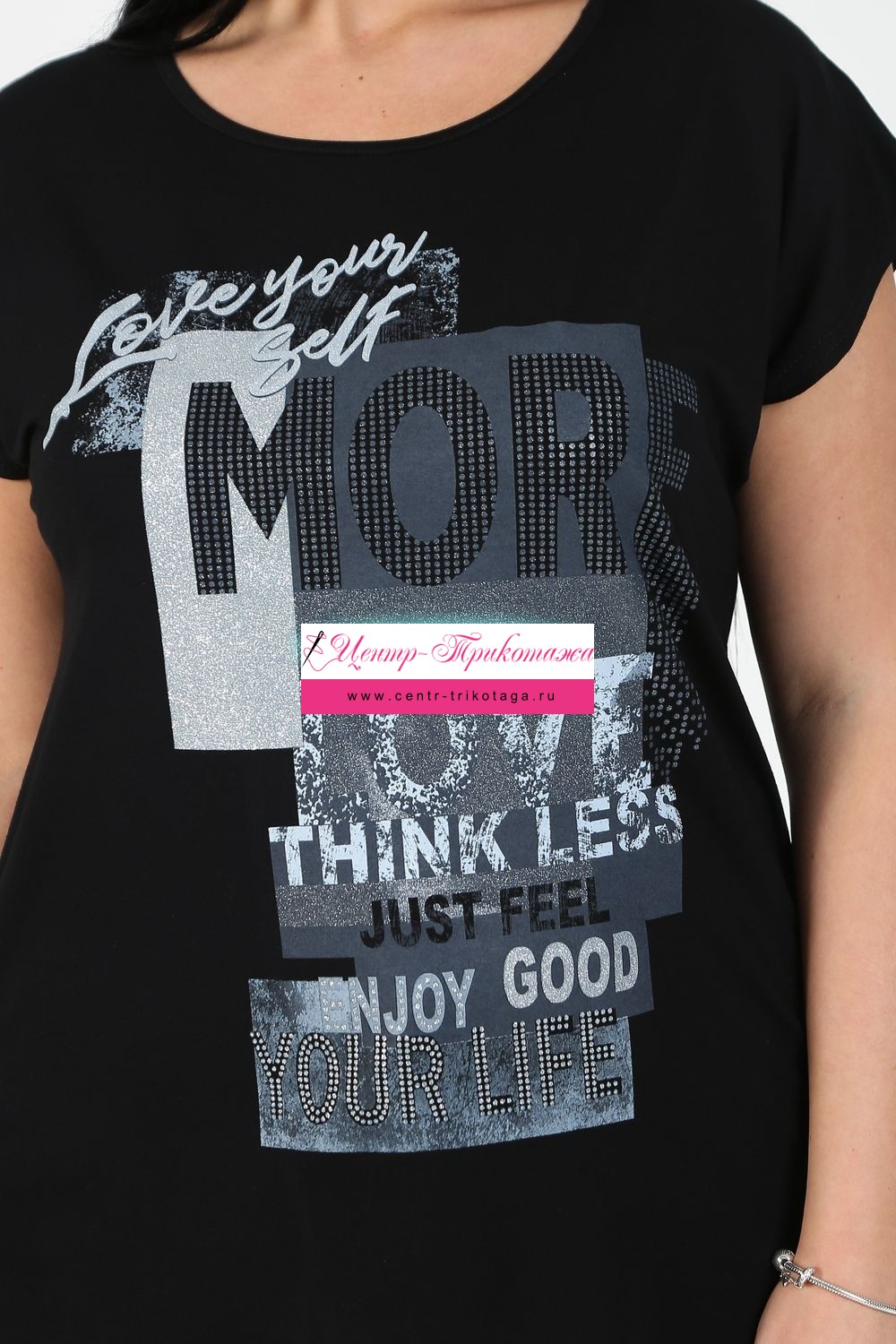 Модель свободного силуэта длиной до линии бёдер, со спущенной проймой. На передней части изделия нанесена стильная современная печать, боковой шов переходит в небольшой разрез, низ спереди чуть короче, чем спинка. Футболка изготовлена из приятной и комфортной вискозы, сочетается с любой одеждой.