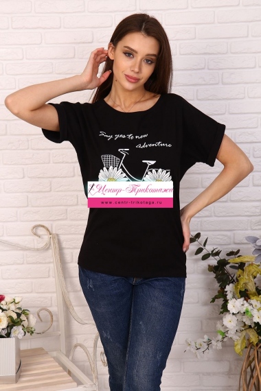 Футболка женская с принтом - ромашки в виде велосипеда, из кулирки с лайкрой качества ПЕНЬЕ. Модель свободного покроя, вырез горловины в виде лодочки , спущенная пройма обработана манжетом с отворотом. Футболка приятная к телу, комфортная, подойдёт на любую фигуру.