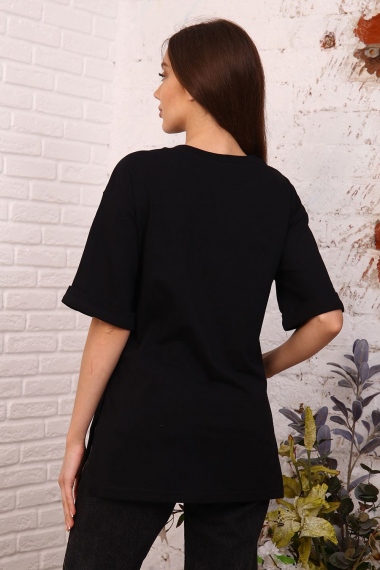 Футболка женская оверсайз. Свободного покроя со спущенными плечами. Горловина округлой формы, по бокам футболки разрезы. На полочке выполнен модный принт. В этой футболке Вы будете выглядеть стильно.