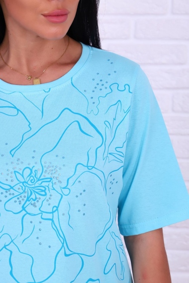 Футболка 4493 женская с нежным принтом во всю полочку понравится многим! Модель свободного кроя, линия плеча прямая, рукав удлиненный до локтя, горловина обработана обтачкой из основного материала, рукава и низ вподгибку.