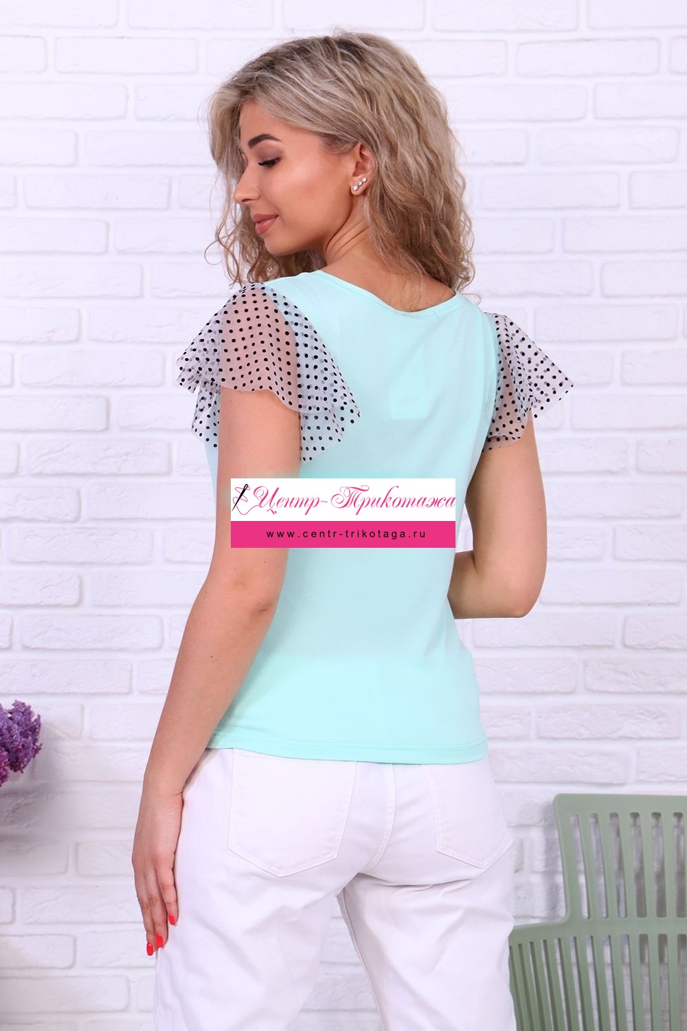 У данной футболки очень интересное дизайнерское решение: на уровне талии расположена полоса из сетки, а также рукава сделаны в форме воланов из сетки. Футболка приталена с округлым вырезом горловины. Она выполнена из вискозы плотностью 210 гр.