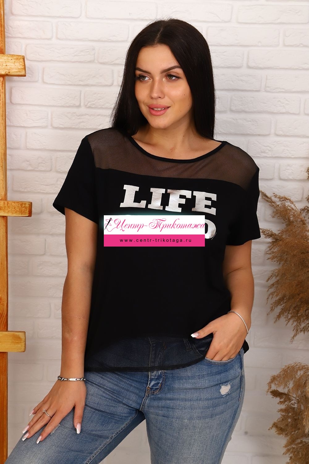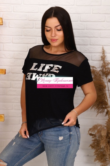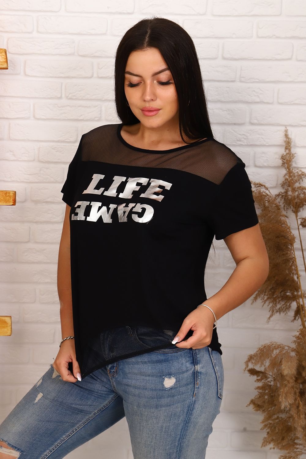 Женская футболка полуприлегающего силуэта выполнена из приятной к телу вискозы и пользующейся большой популярностью сетки. На центральную деталь полочки наложена печать в виде серебристой надписи, что делает футболку ещё более привлекательной. По мнению модных специалистов вещи с сеткой должны стать must - have в гардеробе каждой женщины.