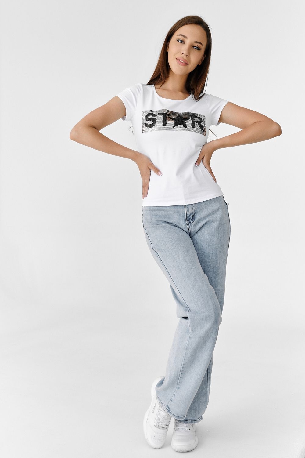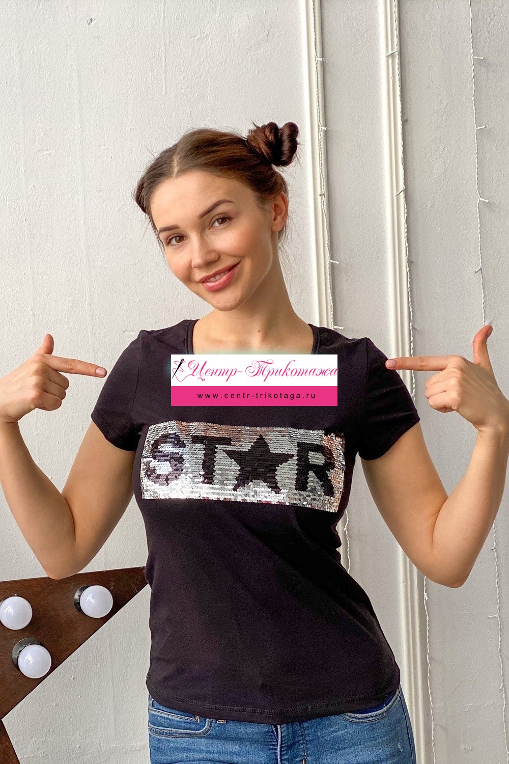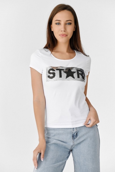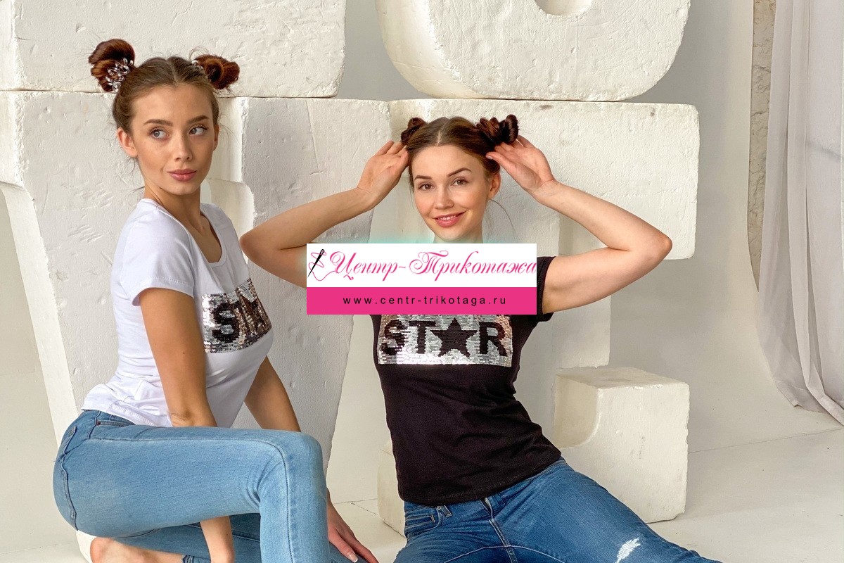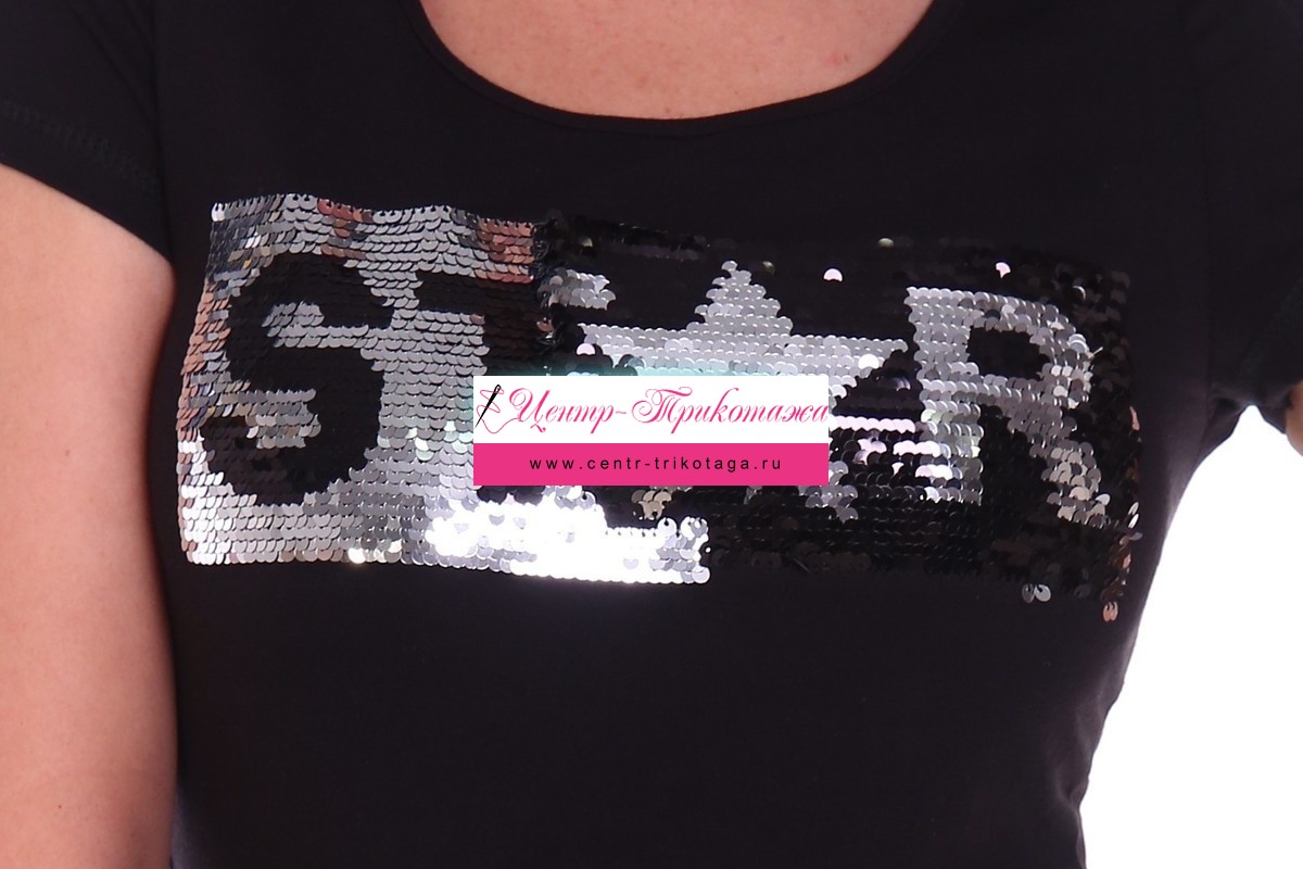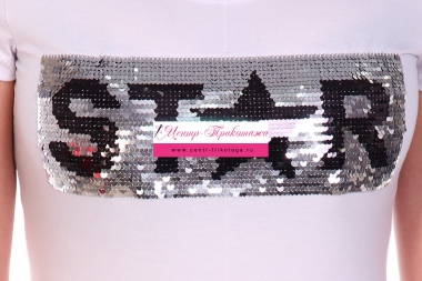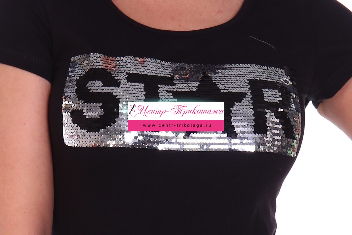 Футболка полуприлегающего силуэта, с округлой горловиной, длиной до середины бедра. Рукав втачной короткий. Горловина обработана бейкой из основного полотна. Пайетки двусторонние