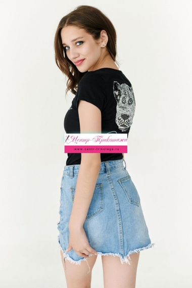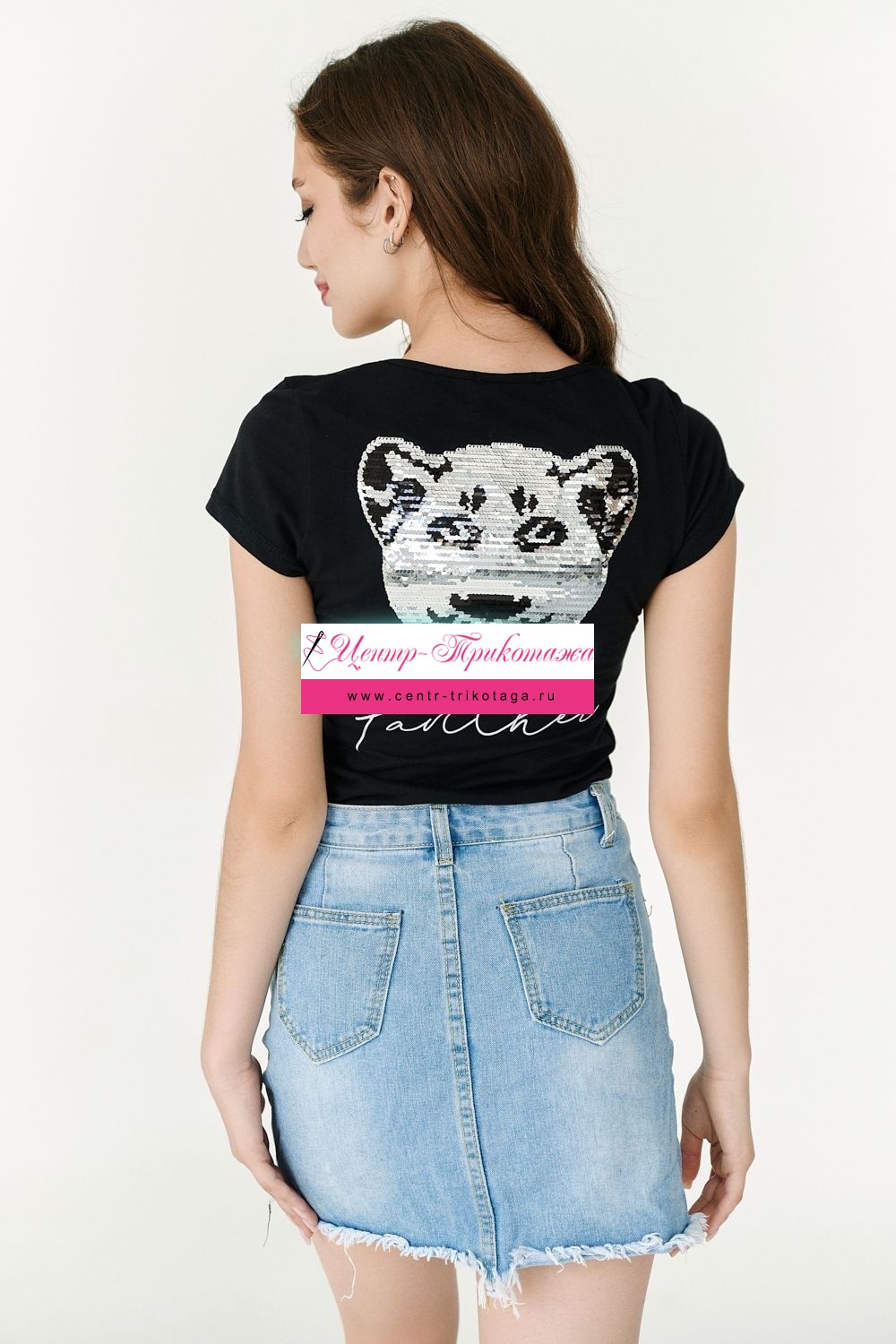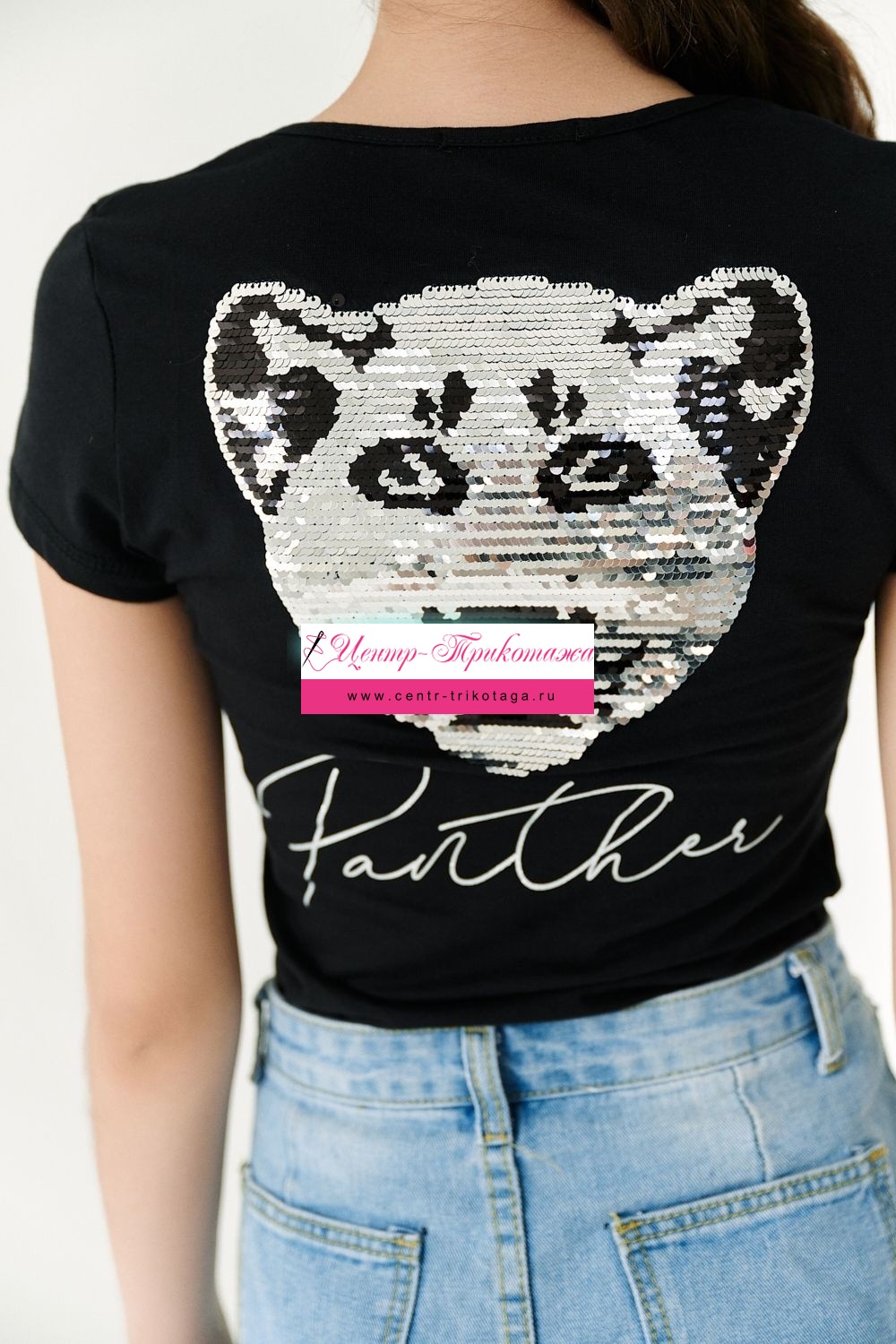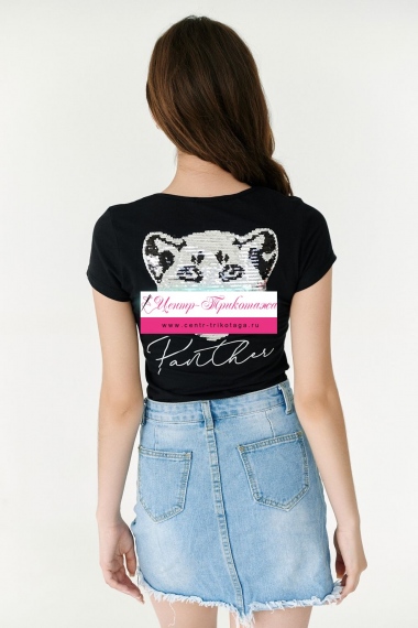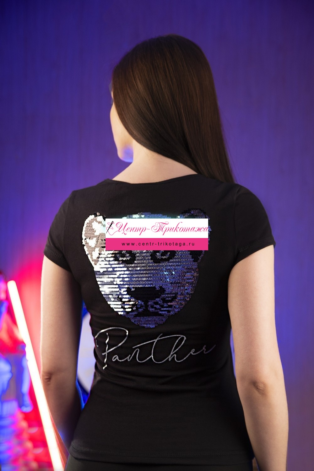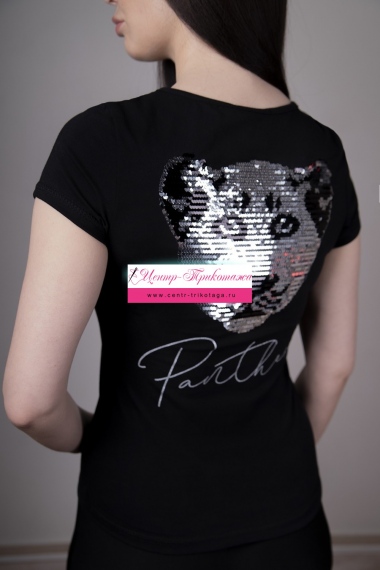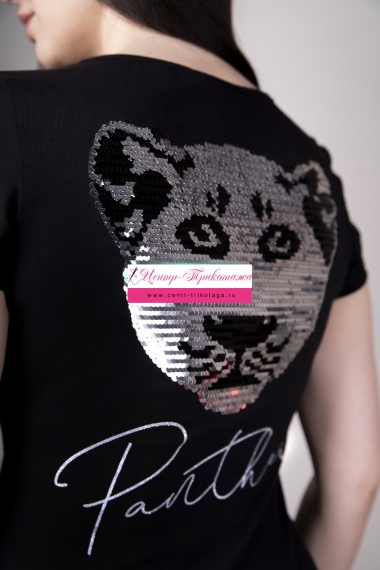 Футболка полуприлегающего силуэта, с округлой горловиной, длиной до середины бедра. Рукав втачной короткий. Горловина обработана бейкой из основного полотна. На спине большая аппликация из пайеток в виде головы пантеры и печать-надпись серебряным глиттером. На передней полочке небольшая печать.