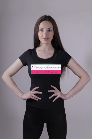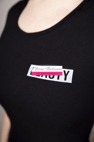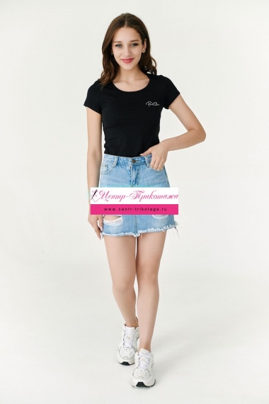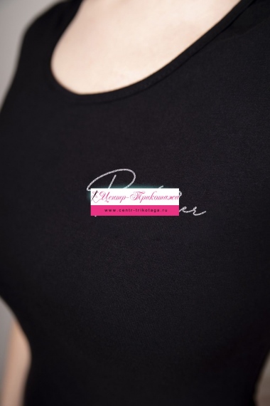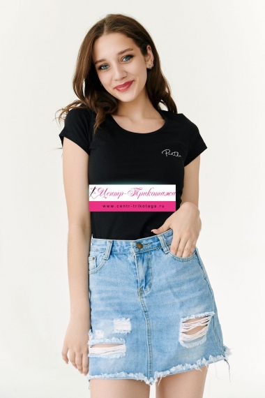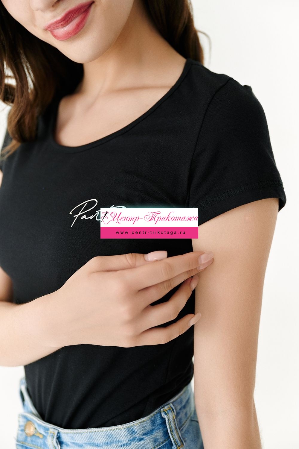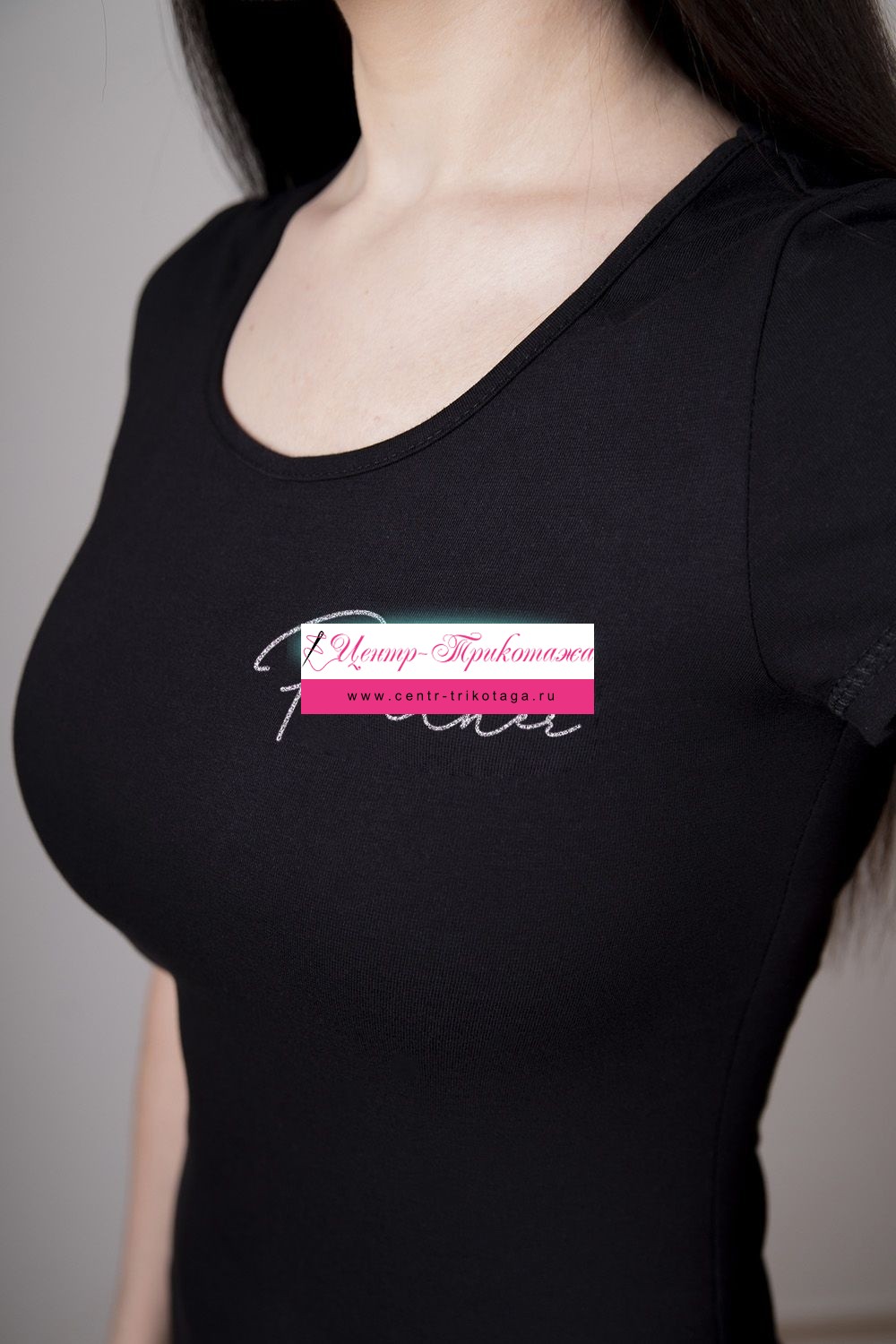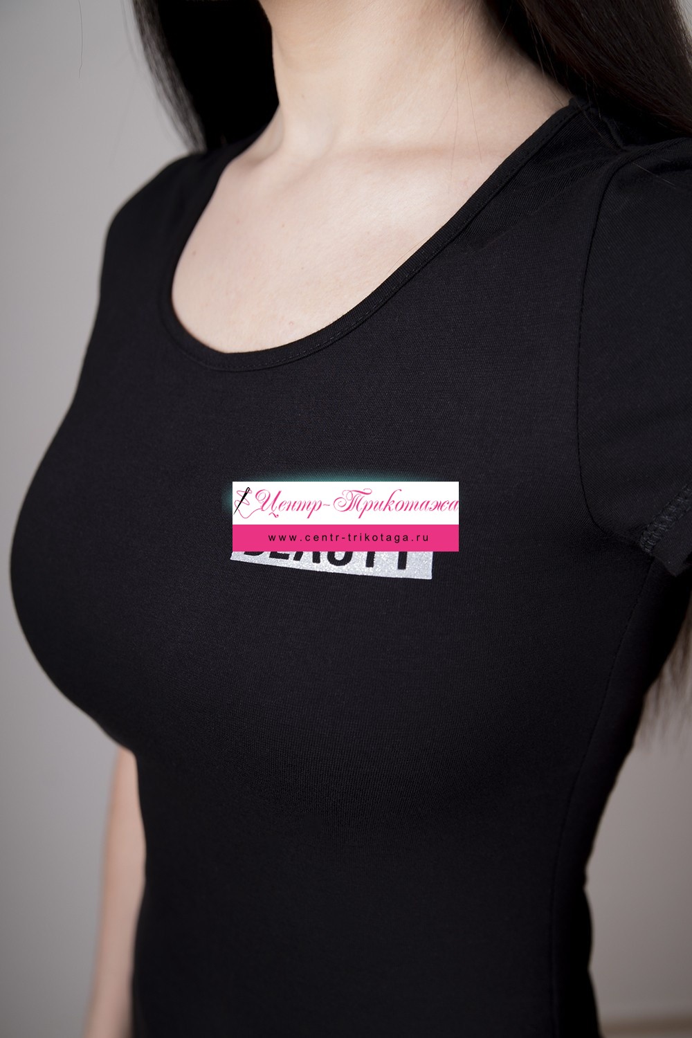 Футболка полуприлегающего силуэта, с округлой горловиной, длиной до середины бедра. Рукав втачной короткий. Горловина обработана бейкой из основного полотна. На спине большая аппликация из пайеток в виде головы пантеры и печать-надпись серебряным глиттером. На передней полочке небольшая печать.