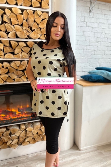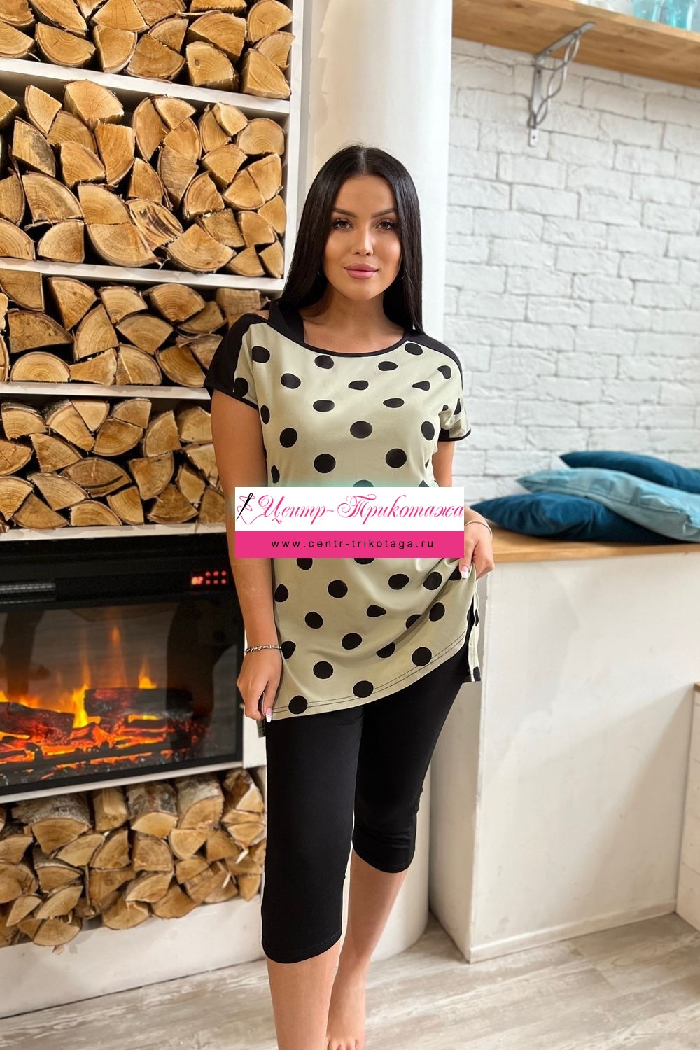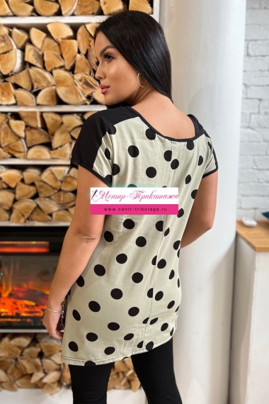 Футболка женская полуприлегающего силуэта, асимметричного кроя. Рукава цельнокроеные короткие. Спинка удлиненная. Одно плечо изделия фиксируется бретелью, в боковых швах разрезы.
