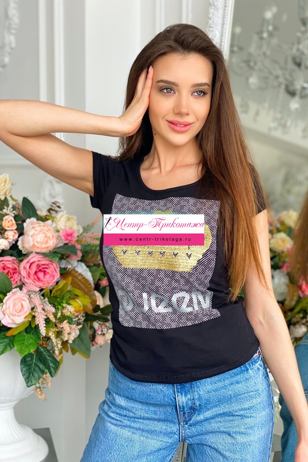 Футболка полуприлегающего силуэта, с округлой горловиной, длиной до середины бедра. Рукав втачной короткий. Горловина обработана бейкой из основного полотна. На полочке эффектная печать из пайеток