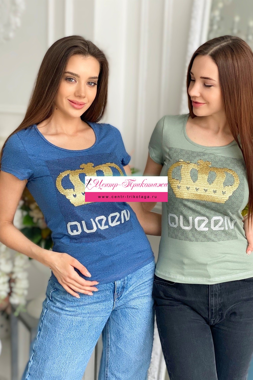 Футболка полуприлегающего силуэта, с округлой горловиной, длиной до середины бедра. Рукав втачной короткий. Горловина обработана бейкой из основного полотна. На полочке эффектная печать из пайеток