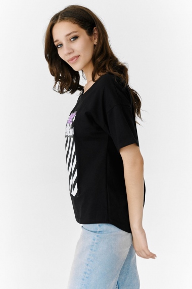 Футболка прямого силуэта, с округлой горловиной спереди и V-образной на спинке, с удлиненной спинкой. Рукав короткий. В верхней части спинки обработан фигурный вырез со шнуром. Горловина обработана бейкой из основного полотна. На полочке эффектная печать с пайетками