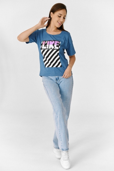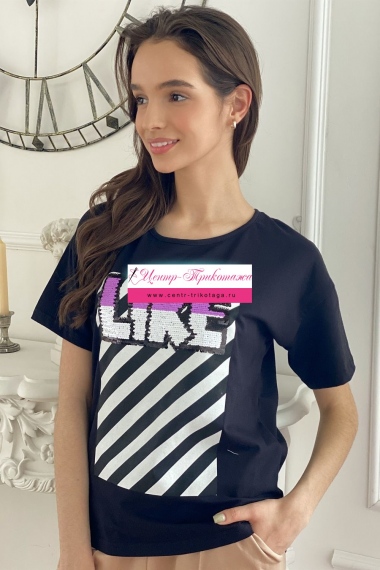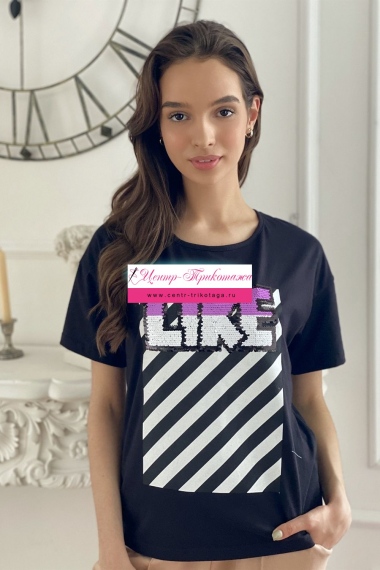 Футболка прямого силуэта, с округлой горловиной спереди и V-образной на спинке, с удлиненной спинкой. Рукав короткий. В верхней части спинки обработан фигурный вырез со шнуром. Горловина обработана бейкой из основного полотна. На полочке эффектная печать с пайетками