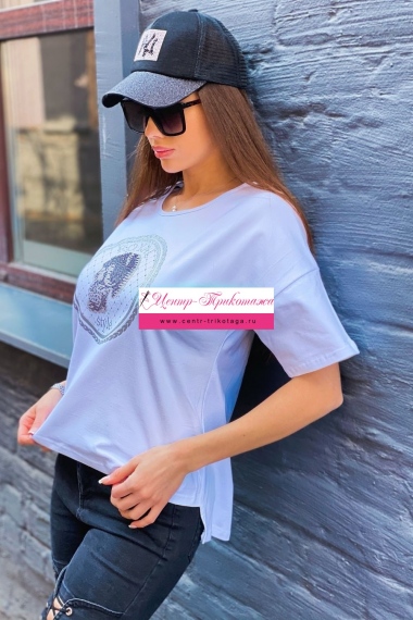 Футболка прямого силуэта, с округлой горловиной, с удлиненной спинкой. Рукав короткий. Горловина обработана бейкой из основного полотна. На полочке эффектная печать в виде черепа из страз.
