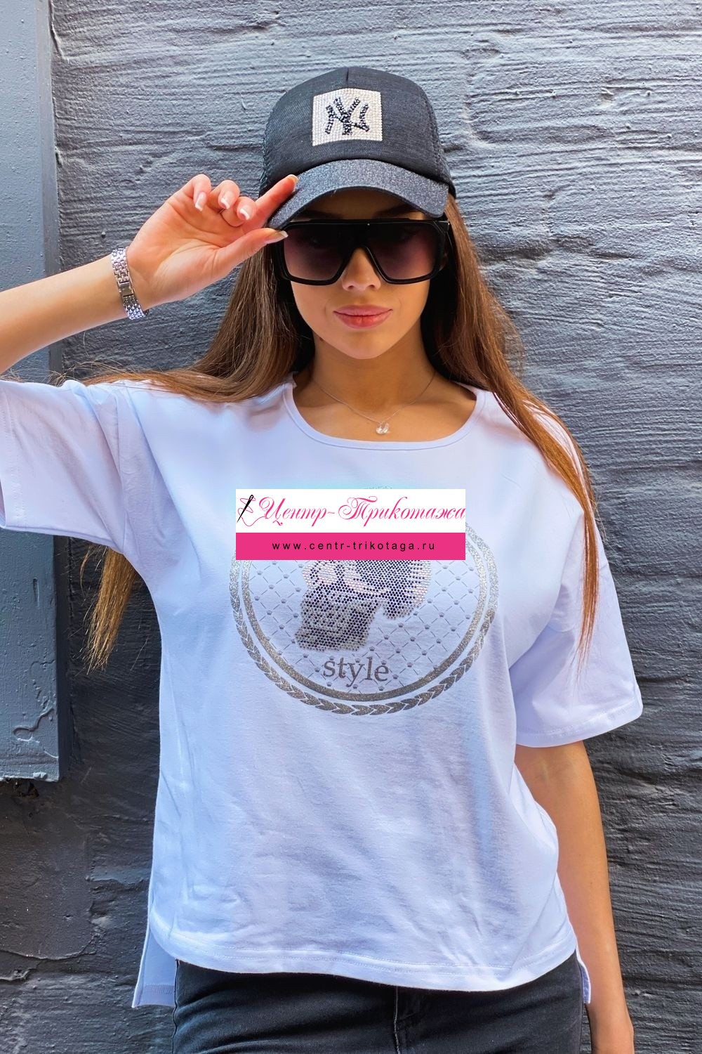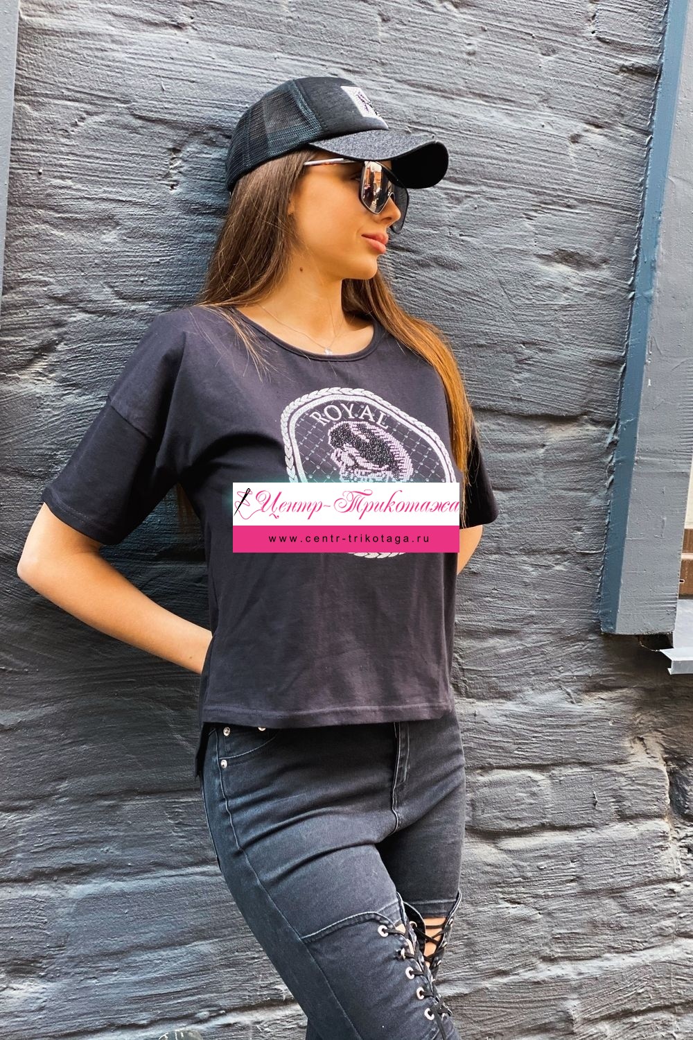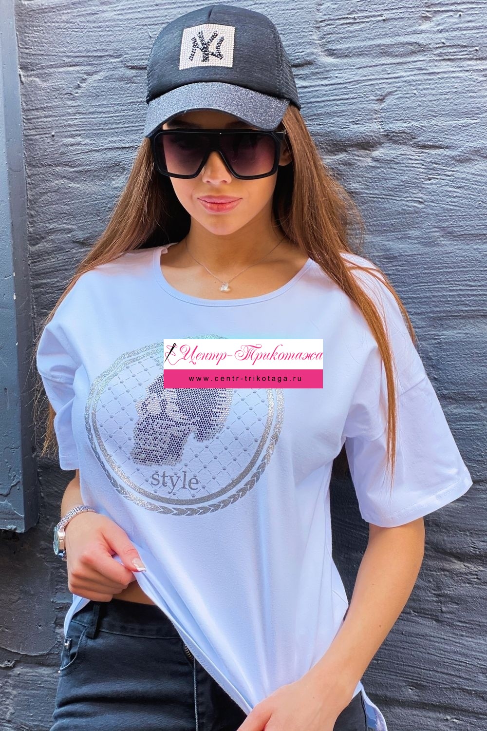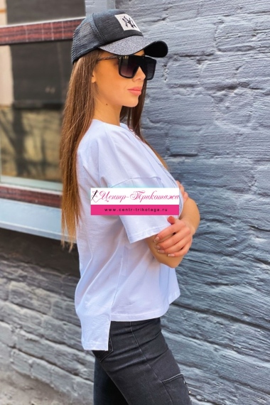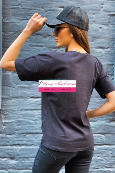 Футболка прямого силуэта, с округлой горловиной, с удлиненной спинкой. Рукав короткий. Горловина обработана бейкой из основного полотна. На полочке эффектная печать в виде черепа из страз.