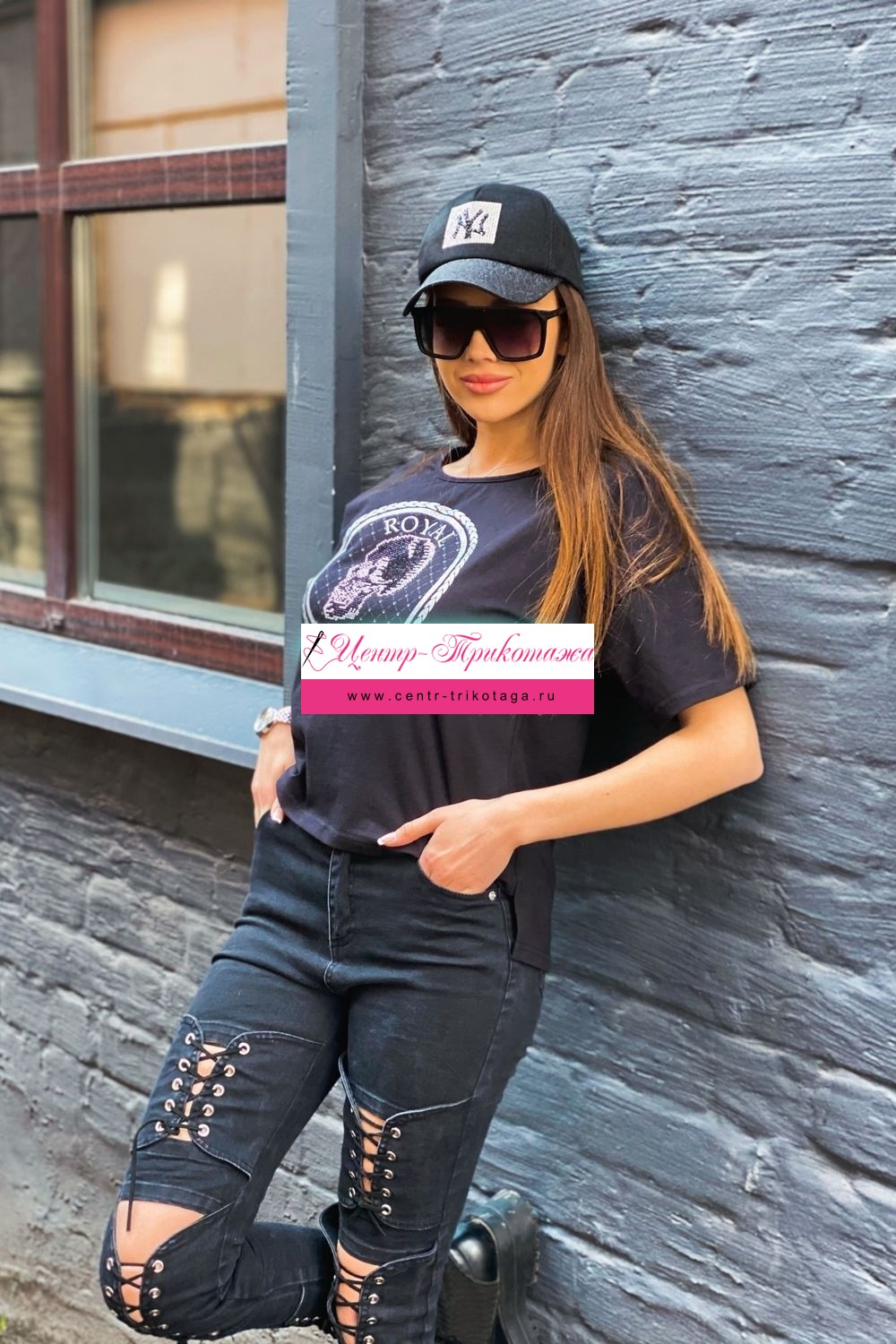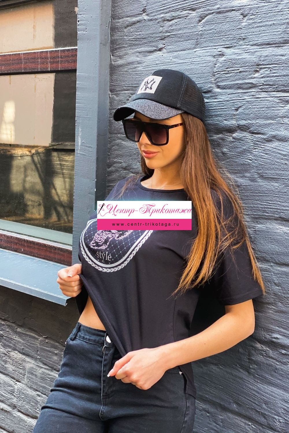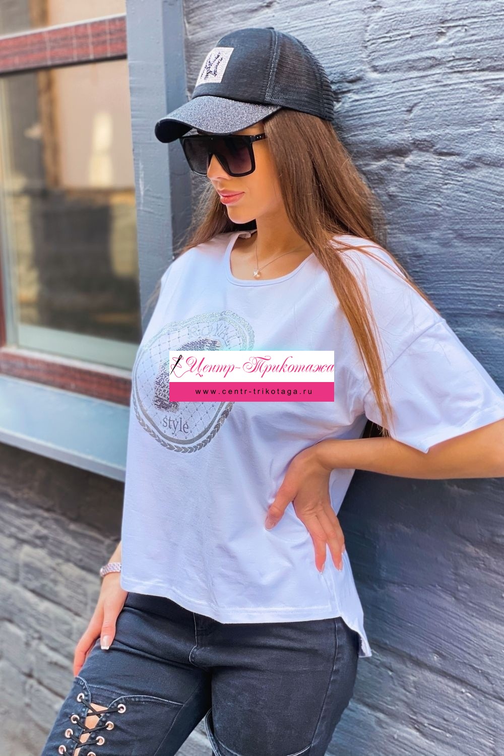 Футболка прямого силуэта, с округлой горловиной, с удлиненной спинкой. Рукав короткий. Горловина обработана бейкой из основного полотна. На полочке эффектная печать в виде черепа из страз.