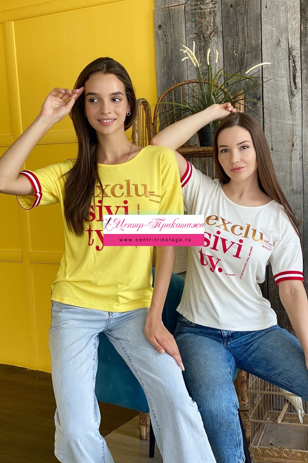 Футболка прямого силуэта, с округлой горловиной спереди, с удлиненной спинкой. Рукав короткий, обработанный декоративной тесьмой. В верхней части спинки обработан фигурный вырез с тесьмой. Горловина обработана бейкой из основного полотна.