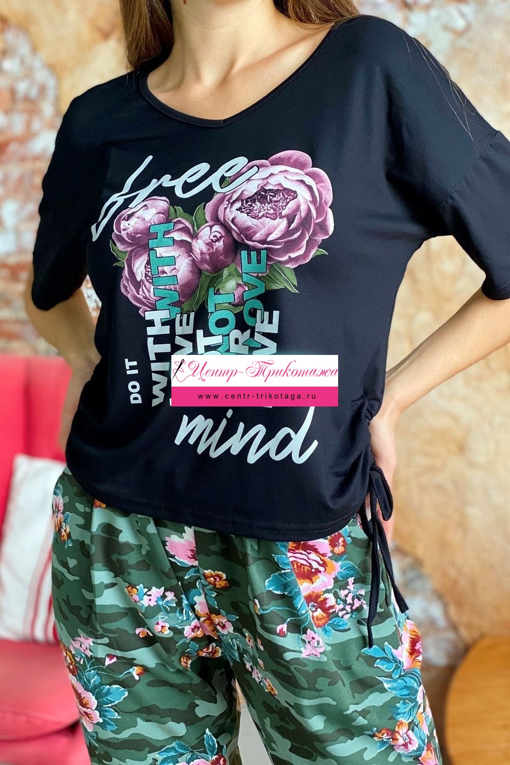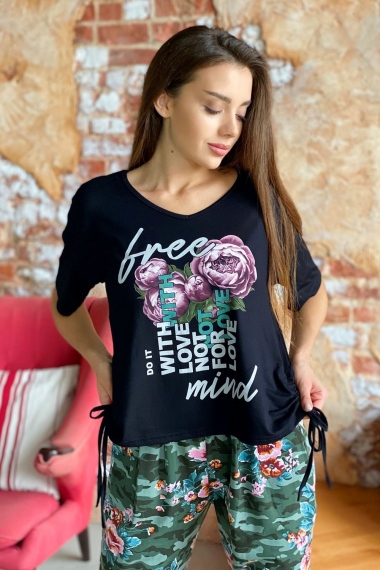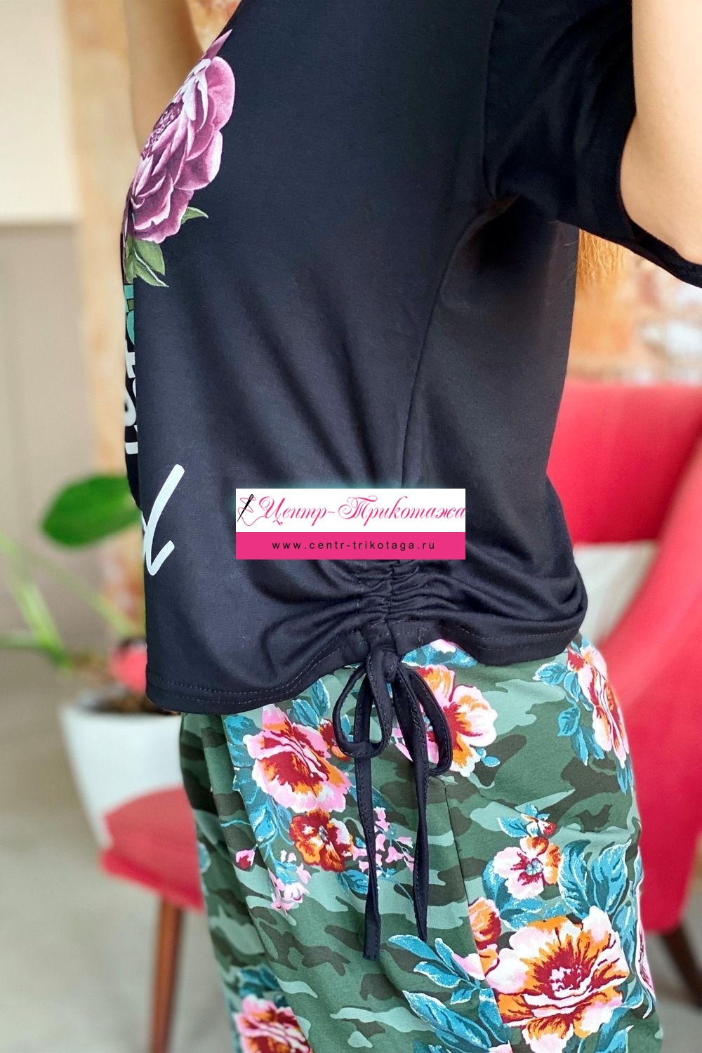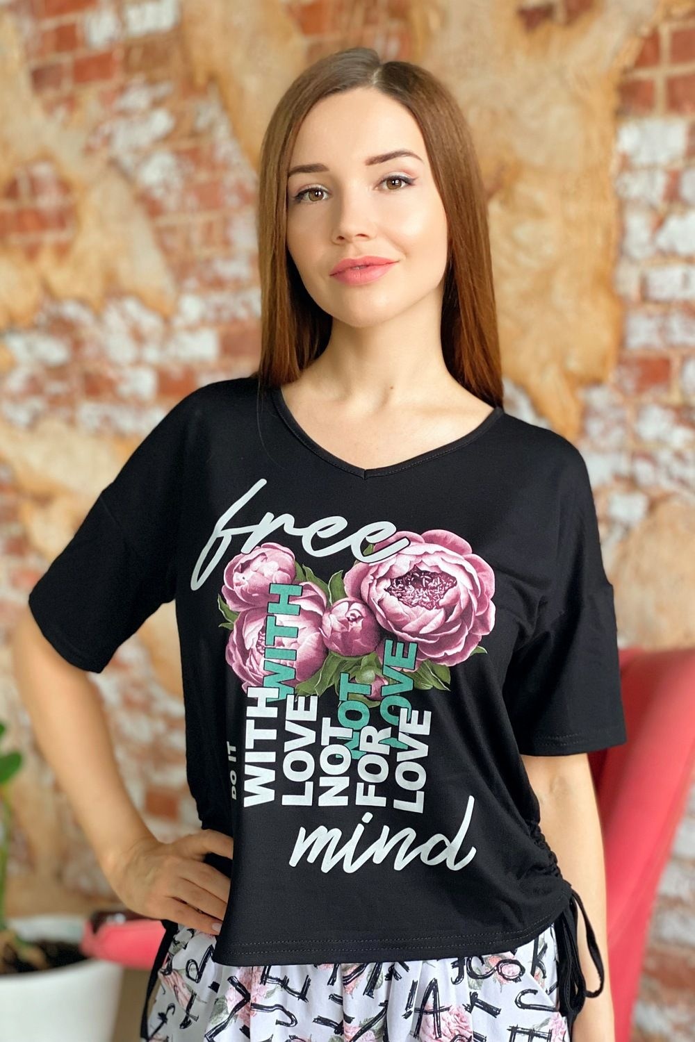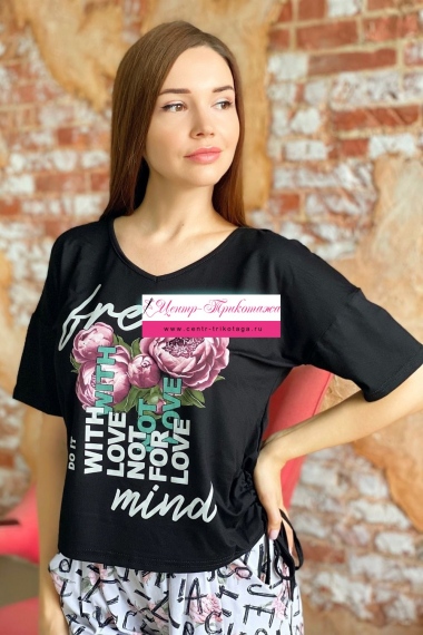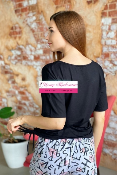 Футболка прямого силуэта, с V-образной горловиной. Рукав короткий. В нижней части боковых швов обработаны утяжки со шнурами. Горловина обработана бейкой из основного полотна
