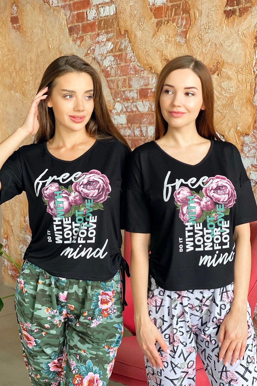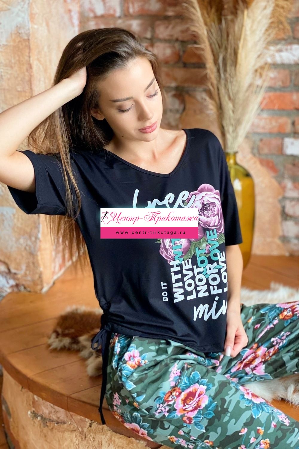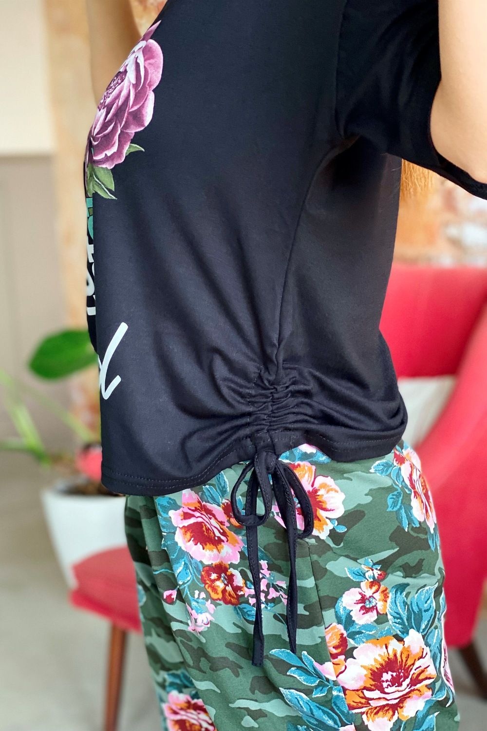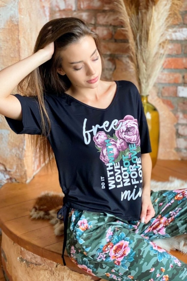 Футболка прямого силуэта, с V-образной горловиной. Рукав короткий. В нижней части боковых швов обработаны утяжки со шнурами. Горловина обработана бейкой из основного полотна