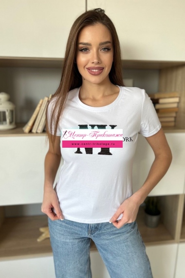 Футболка прямого силуэта, с фигурной линией низа, с округлой горловиной. Рукав втачной, короткий. Горловина обработана обтачкой из основного полотна. На полочке эффектно сочетаются аппликация из пайеток в виде букв NY и печать New York