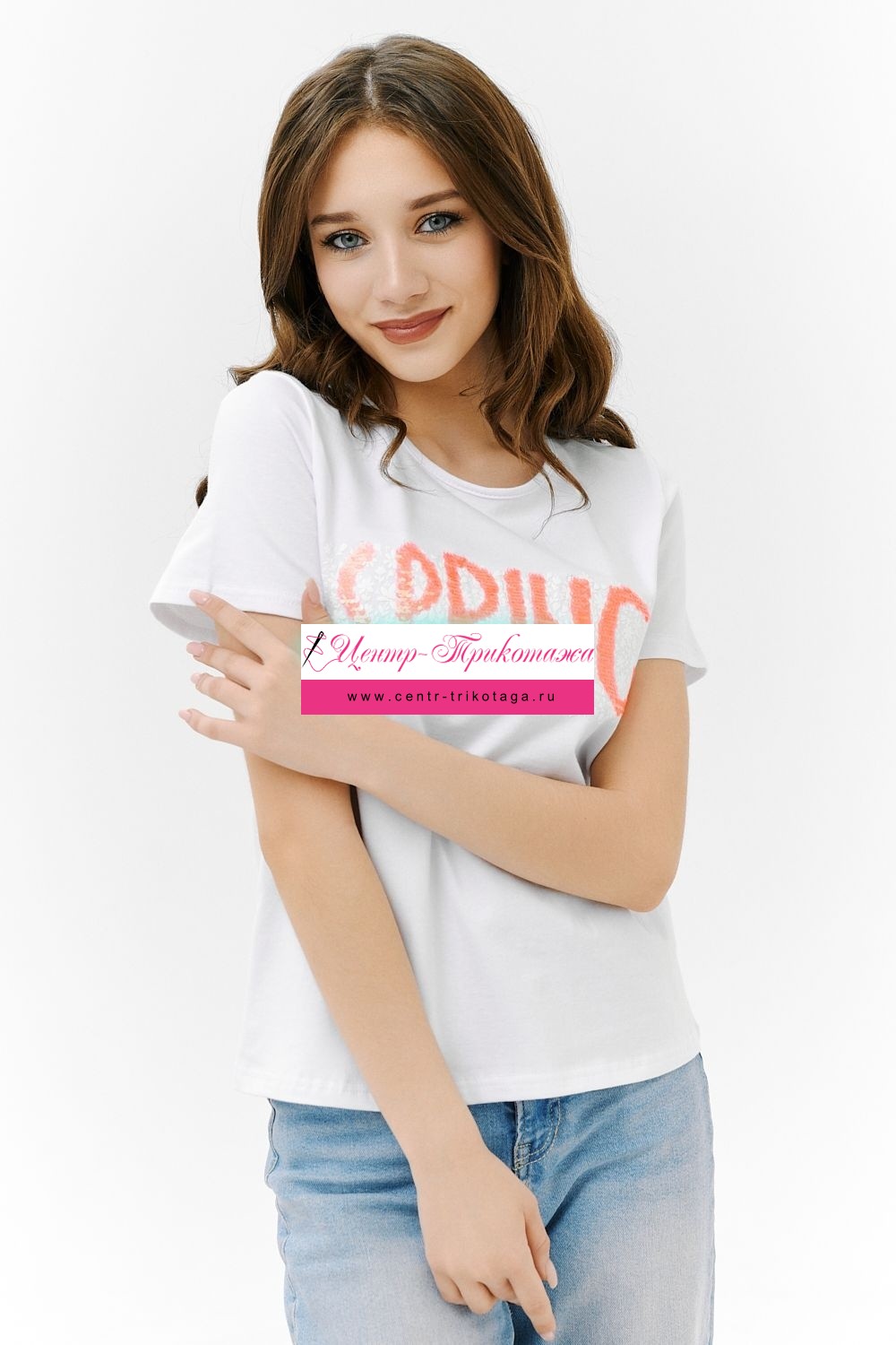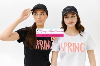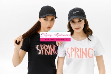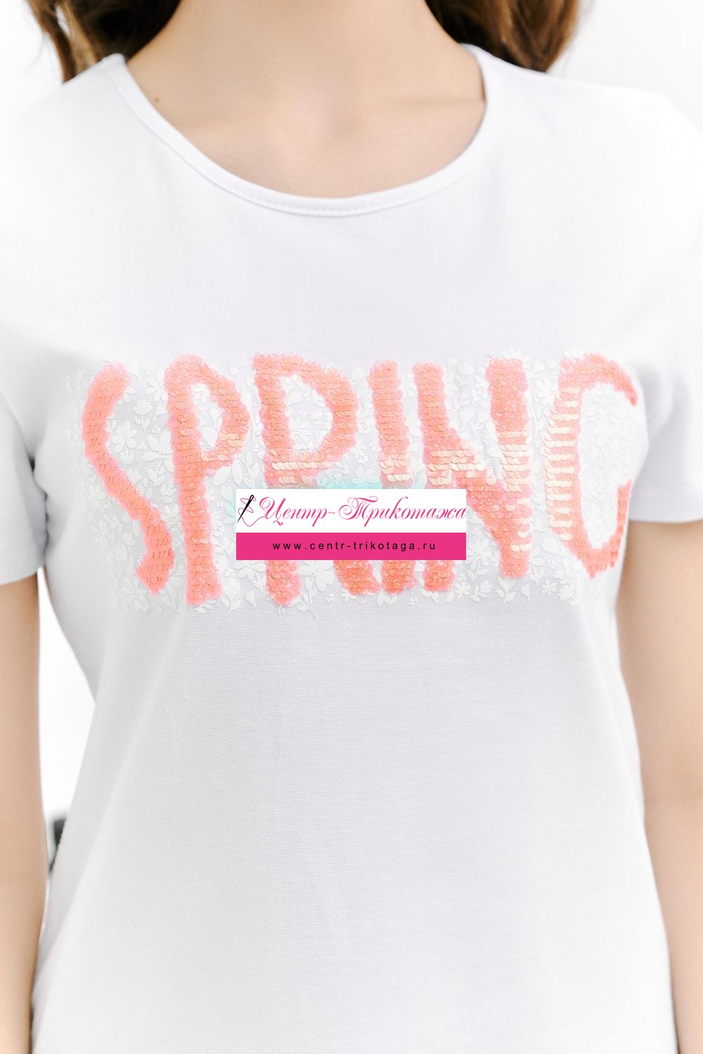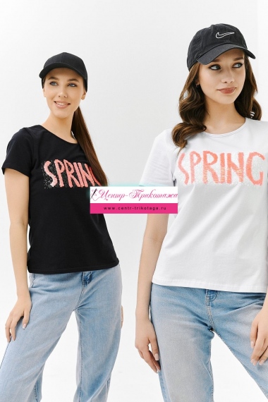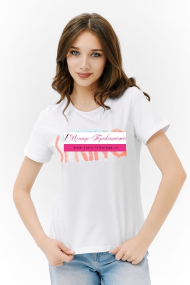 Футболка прямого силуэта, с округлой горловиной, длиной до середины бедра. Рукав втачной, короткий. Горловина обработана бейкой из основного полотна. На полочке эффектная переливающаяся аппликация с пайетками