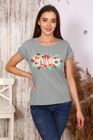 Футболка прямого силуэта, с округлой горловиной, длиной до середины бедра. Рукав втачной, короткий, с отворотом. На полочке расположен накладной карман с клапаном. Горловина обработана обтачкой из эластичного полотна.