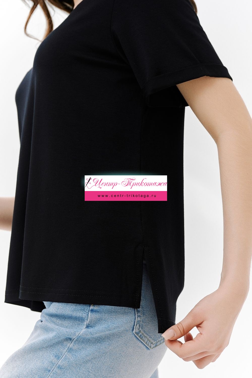 Футболка прямого силуэта, с V-образной горловиной, с разрезами в нижней части боковых швов. Спинка с кокеткой, удлиненная. Горловина обработана бейкой из основного полотна.