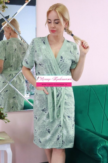 Халат женский из красивой нежной расцветки с розочками. Халат на молнии. По горловине, карману и низу изделия отделочная бейка. Низ изделия закруглен к боковому шву.