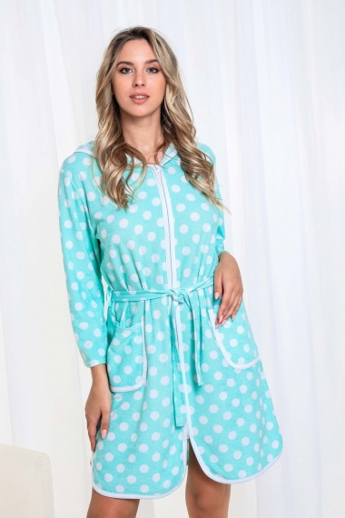 Удобный женский халат из легкой хлопковой махры. Модель с застежкой на молнии, с капюшоном, двумя карманами по бокам и длинным рукавом