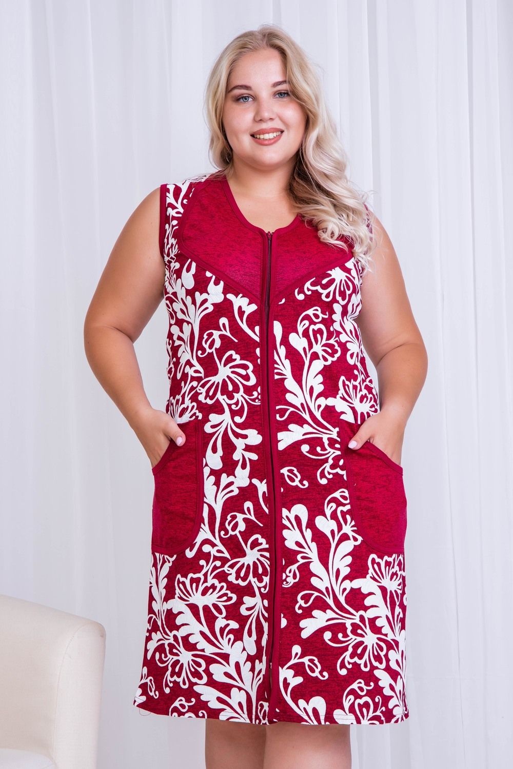 Удобный и практичный халат без рукавов. Застежка на молнию, оригинальный крой полочки. Отлично подходит для лета.