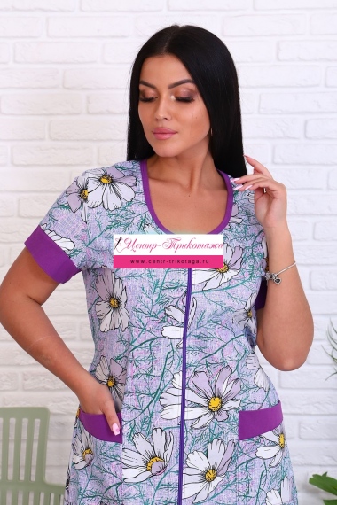 Красивый и практичный женский халат на молнии выполнен из 100% хлопчатобумажной ткани. Изделие дополняет яркая сиреневая отделка по рукавам, карманам и низу изделия. Данная модель прекрасно подойдёт для дома, дачи и отдыха, создавая по-настоящему женственный образ.