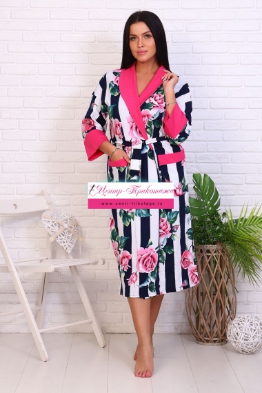 Женский халат средней длины, V-образный вырез горловины, по бокам фигурные вставки черного цвета, визуально корректирующие фигуру