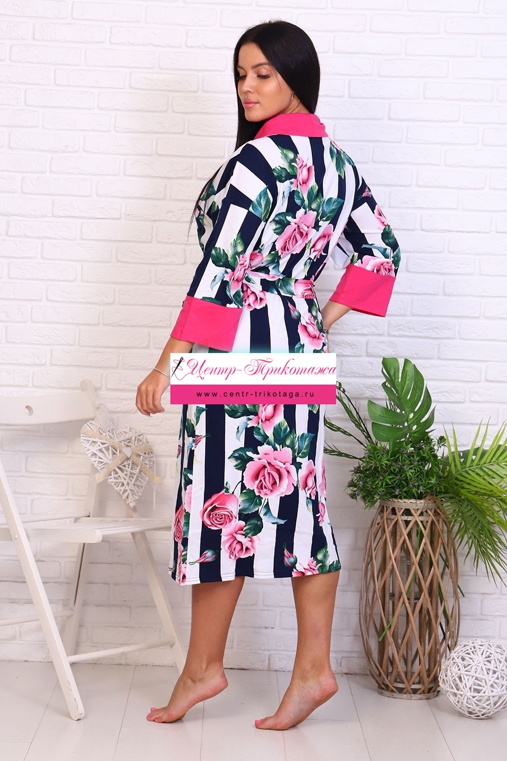 Оригинальный женский халат с красивым принтом на ткани в виде полос и роз. Застегивается на запах с поясом, длина ниже колена