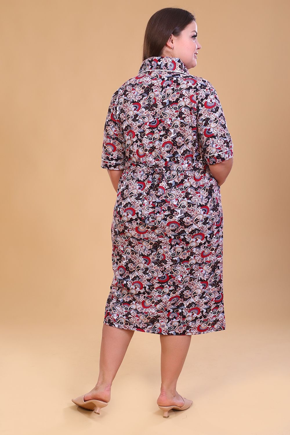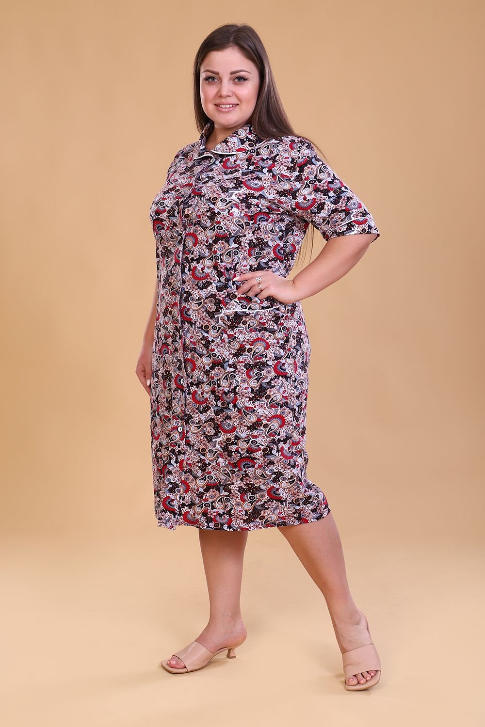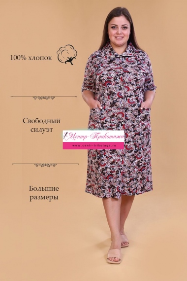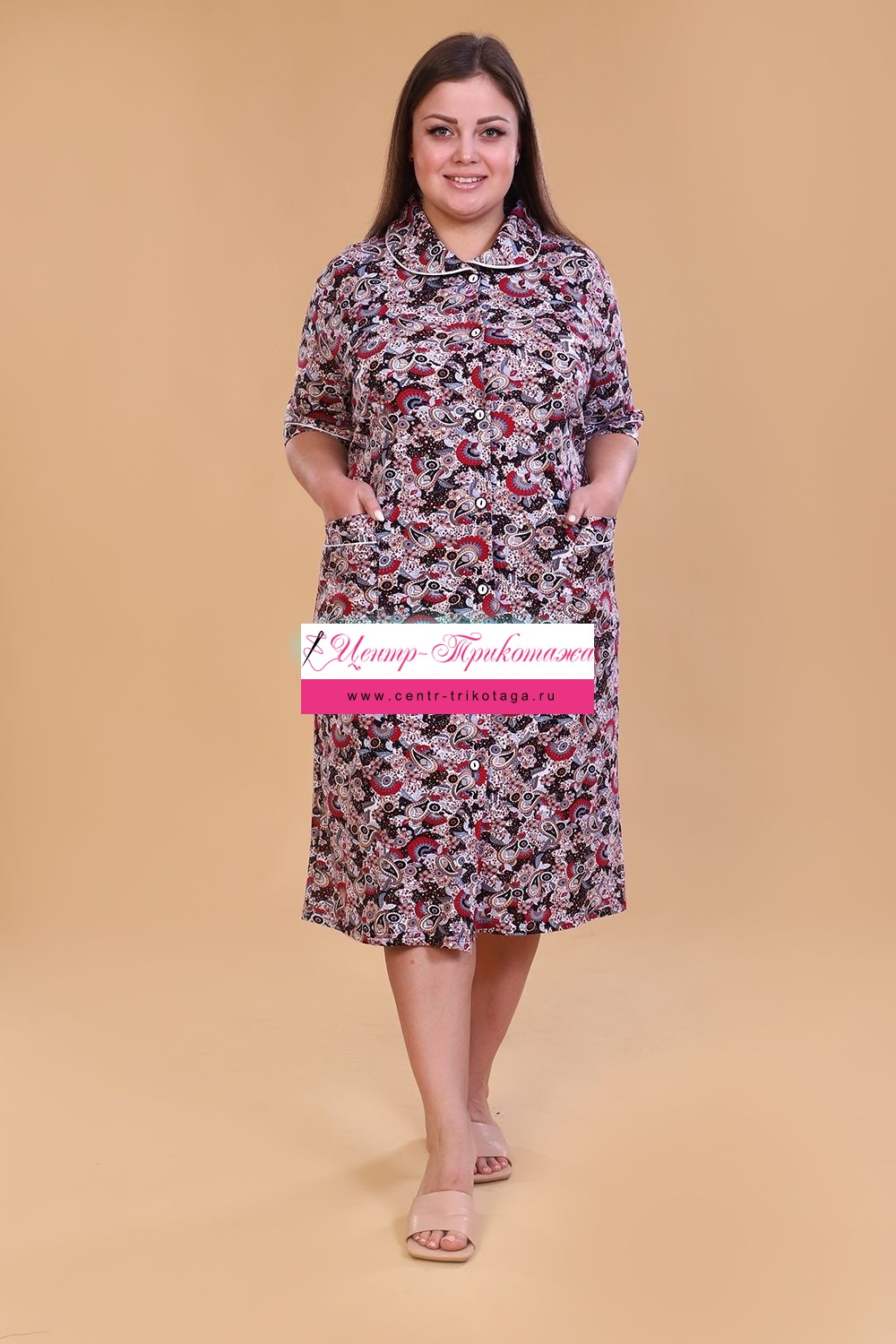 Халат женский на пуговицах, с отложным воротником, накладными карманами. Изготовлен из натурального хлопка. Длина изделия ниже колена, свободный покрой обеспечит вам удобство и не стеснит ваших движений. На спинке халата есть 2 полупояса, которые регулируют объем в талии. В такой модели будет удобно женщине любого возраста. На модели 52 размер