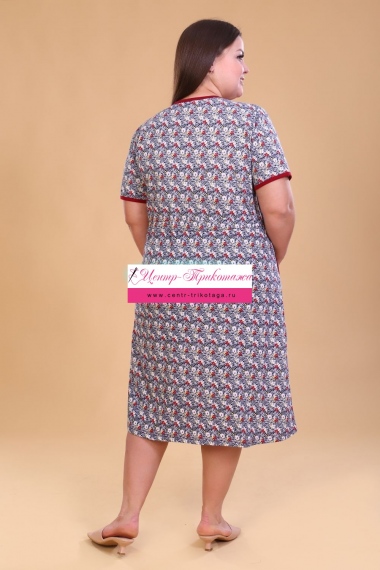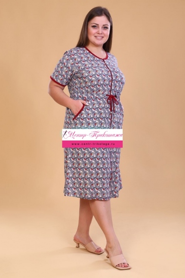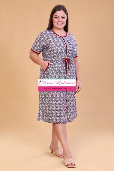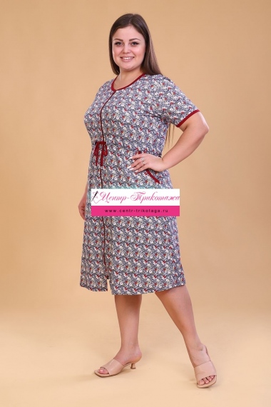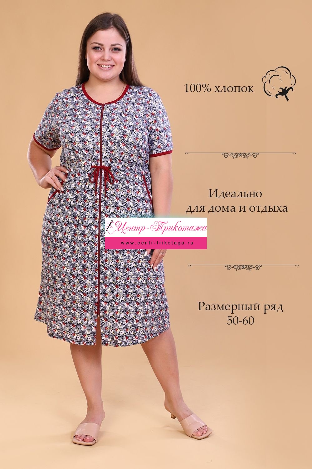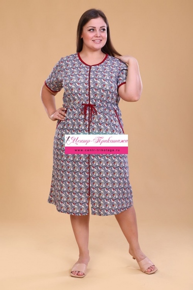 Женский халат из натурального 100% хлопка. Для удобства посадки на талии предусмотрена кулиска. Халат свободного покроя и длиной ниже колена не стеснит ваших движений. Оригинальный цветочный принт выглядит современно и привлекательно. В такой модели будет удобно женщине любого возраста. На модели 52 размер