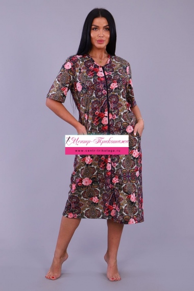 Халат женский из кулирного полотна, прямой силуэт, спущенное плечо, в боковых швах внутренние карманы, застежка на петли-пуговицы, низ изделия обработан на плоскошовной машине, на полочке принт. Благодаря натуральному составу вам будет комфортно и уютно. Халат выполнен по эксклюзивному лекалу. Это модель прекрасно подходит для дома, дачи, отдыха. Оригинальный принт выглядит модно и современно.