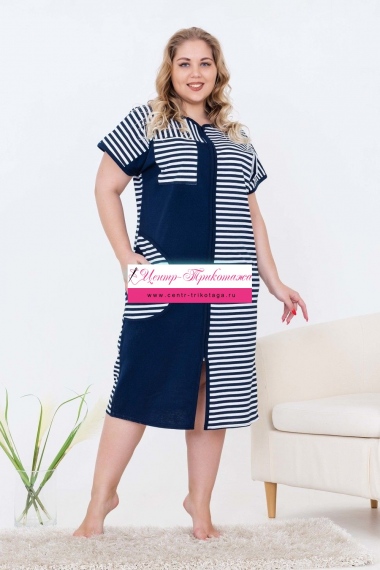 Халат женский домашний, средней длины на молнии, с комфортной посадкой по фигуре. Украшением изделия служит комбинирование тканей: полоска и однотонная ткань. С одной стороны полочки - отрезная кокетка с накладным карманом вверху и внизу. Ткань изделия - кулирная гладь 100% хлопок.