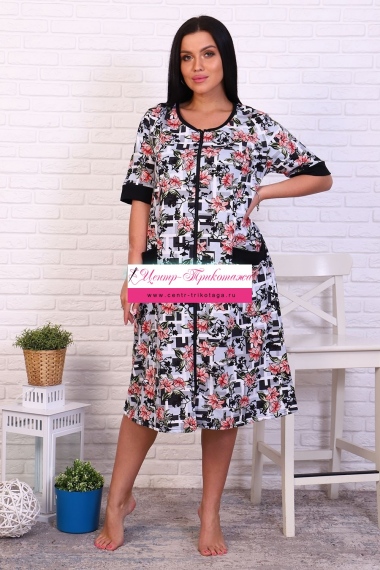 Халат женский, длиной ниже колена, свободного кроя. Рукав ниже локтя. Накладные карманы. Идеально подойдет на любую фигуру.