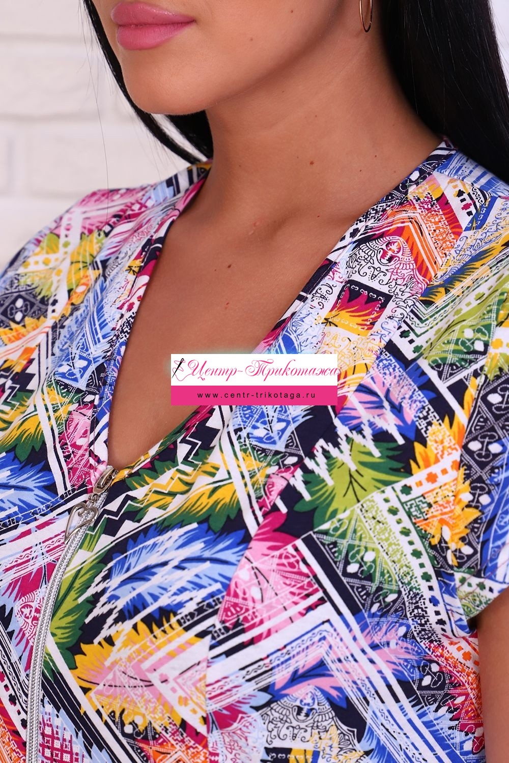 Халат женский оригинальной летней расцветки, выполнен из 100% хлопка. Горловина имеет V-образный вырез, рукав короткий. Халат на серебристой молнии средней длины. Модель очень лёгкая, подойдёт для повседневной носки и отдыха.