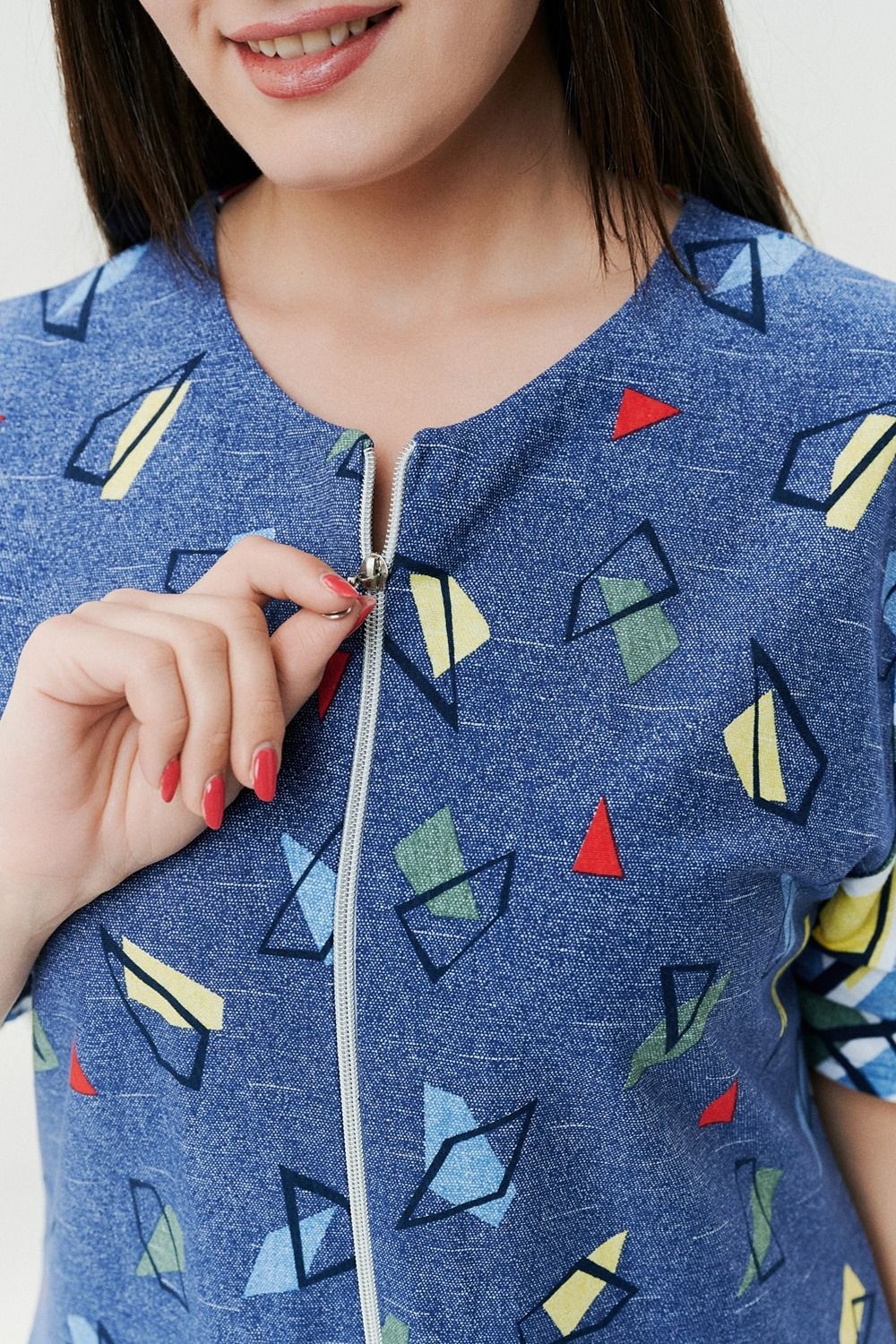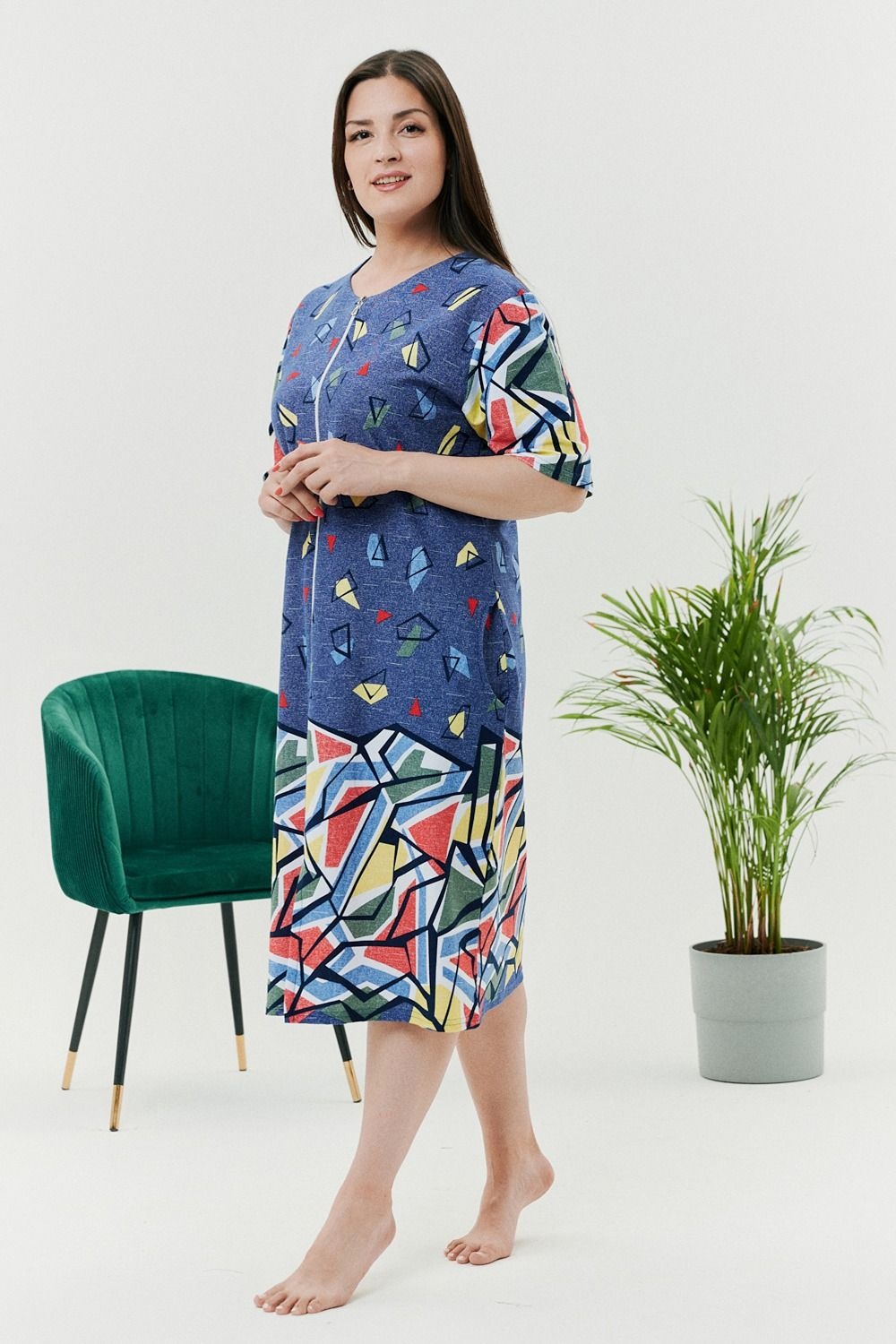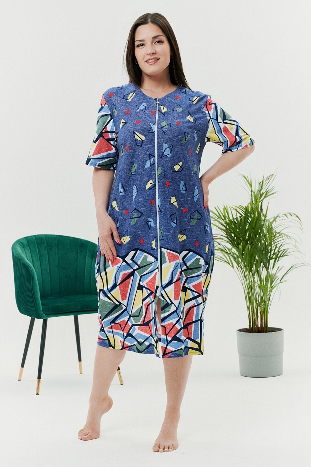 Летний легкий халат из комбинированной ткани - джинс со вставками из абстрактных узоров. Халат на молнии с карманами по бокам. Длина чуть ниже колена. Рекомендуем заказывать на один размер больше