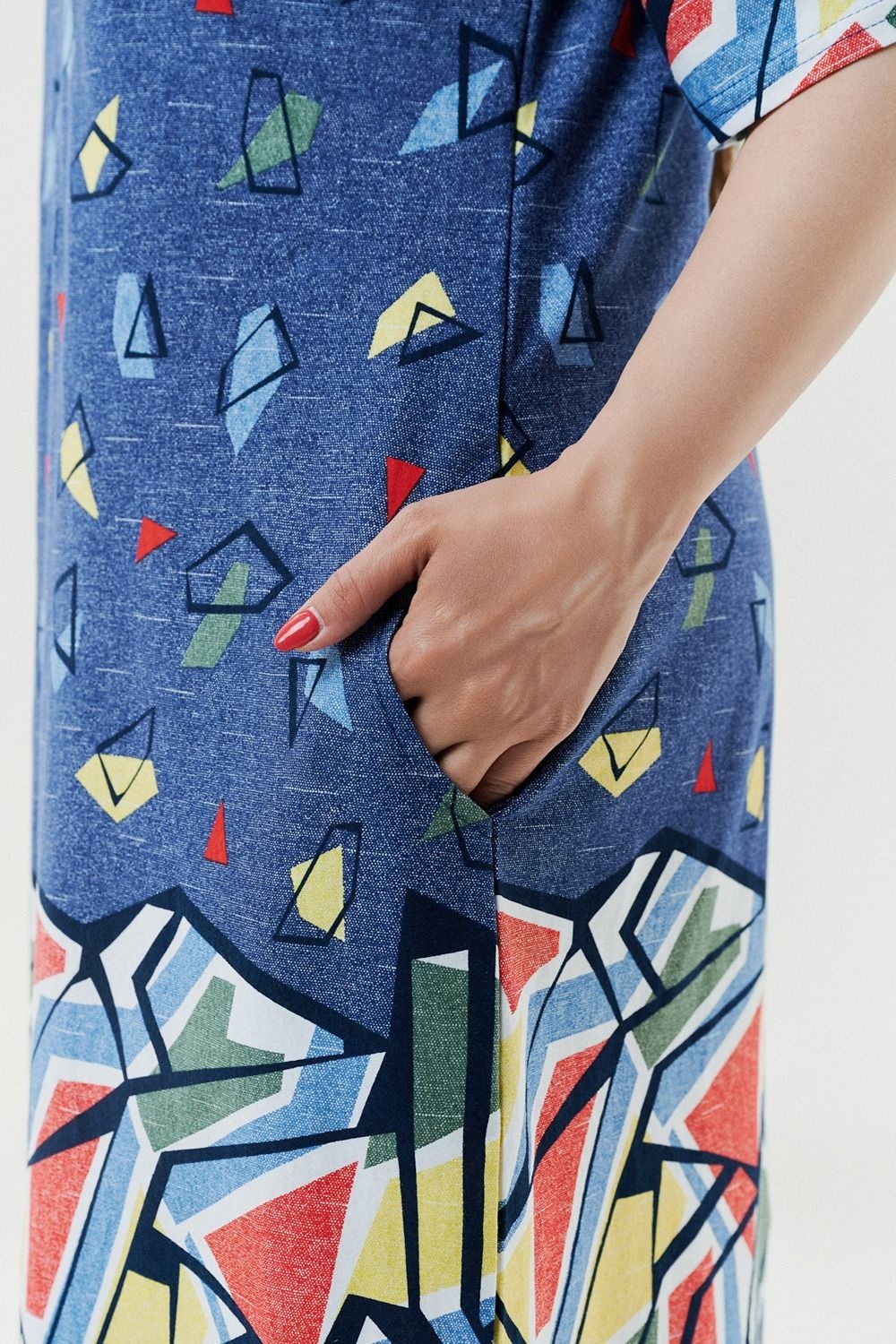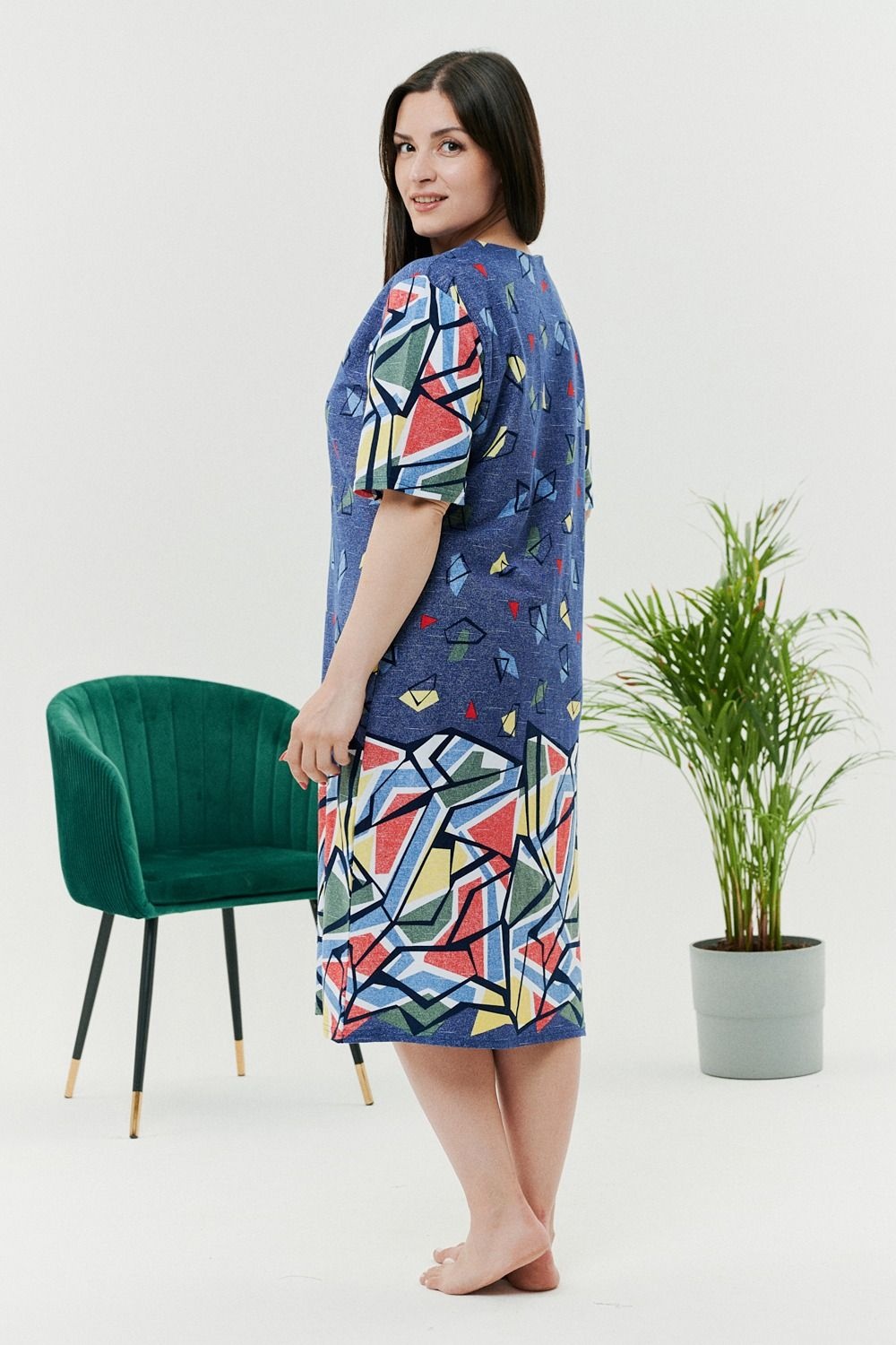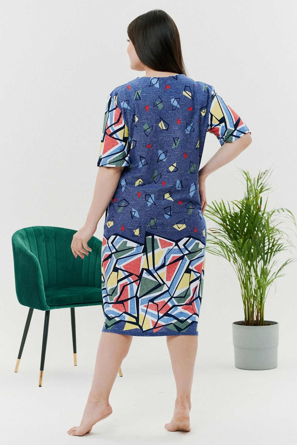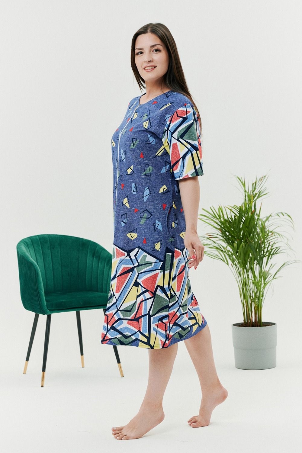 Летний легкий халат из комбинированной ткани - джинс со вставками из абстрактных узоров. Халат на молнии с карманами по бокам. Длина чуть ниже колена. Рекомендуем заказывать на один размер больше