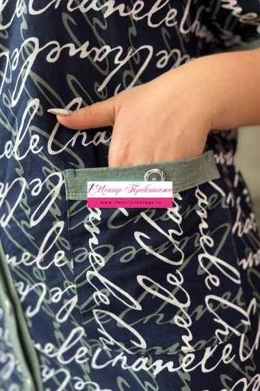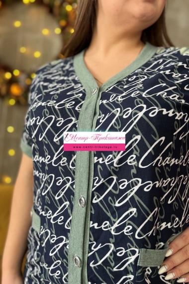 Халат женский прямого силуэта. Рукав цельнокроенный корокий. На полочке два накладных кармана. В боковых швах разрезы. Край борта, низ рукава, верх кармана обработаны широкой окантовкой. По низу халата купон розы, так же этот принт возможен на рукаве. На модели 52 размер