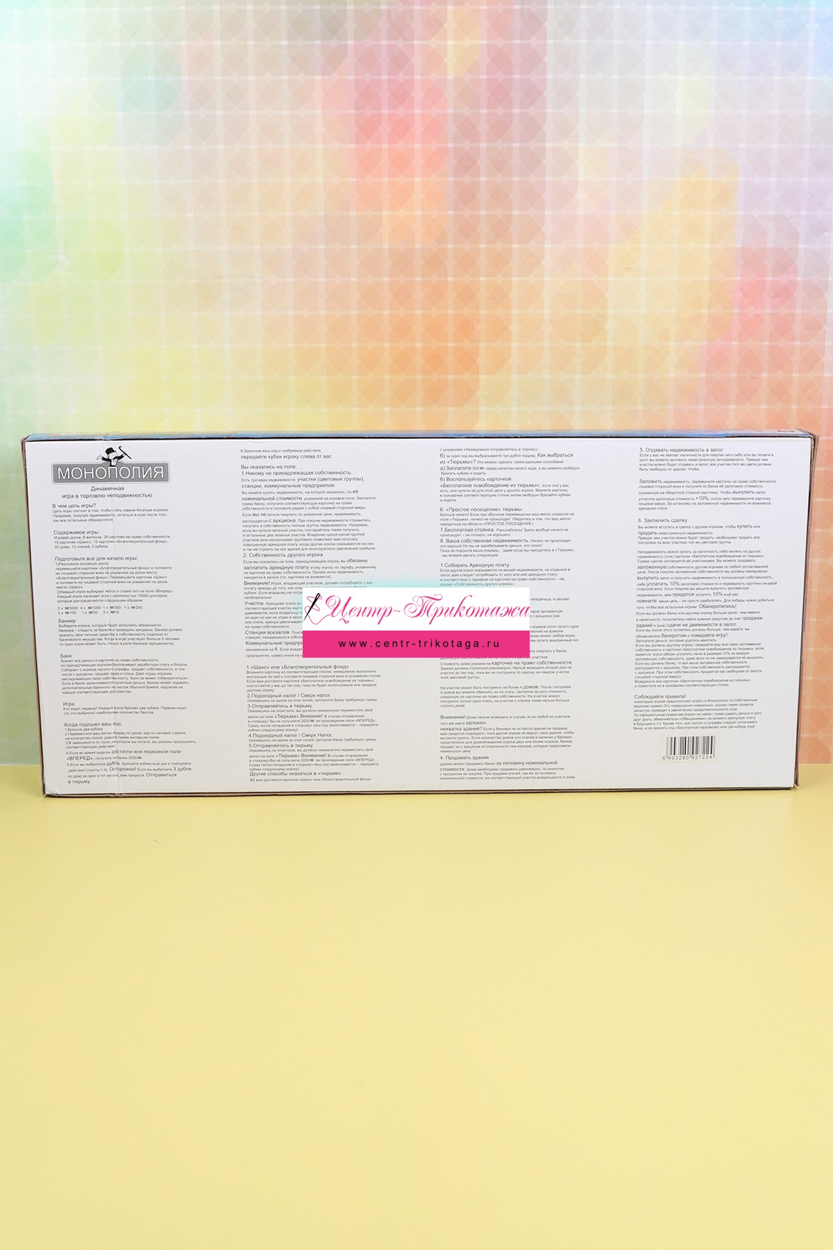 В наборе: игровая доска, 8 жетонов, 28 карточек на право собственности, 15 карточек "Шанс", 15 карточек "Благотворительный фонд", 32 дома, 12 отелей, 2 кубика.